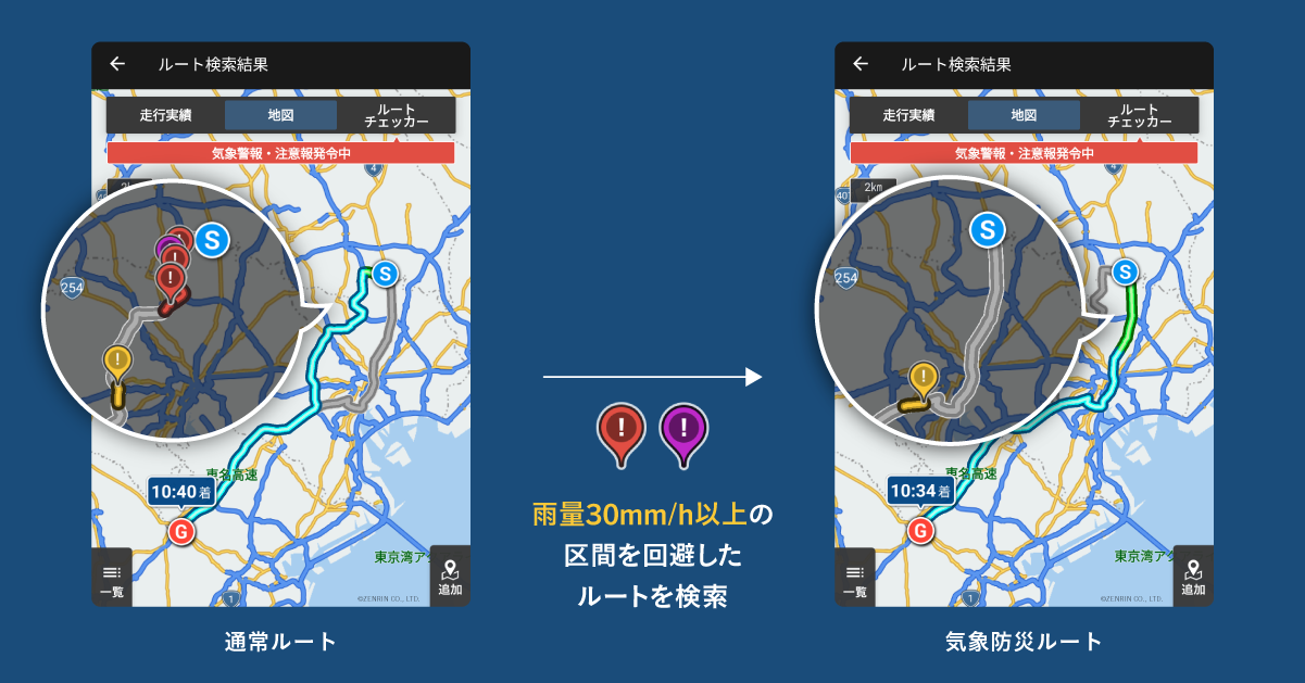 画面上で通常のルート検索結果との比較もできるので、迂回することによる所要時間や距離などの変化を確認して、気象防災ルートで運行するか、天候が回復するまで待機するか、などを判断する一助となります。