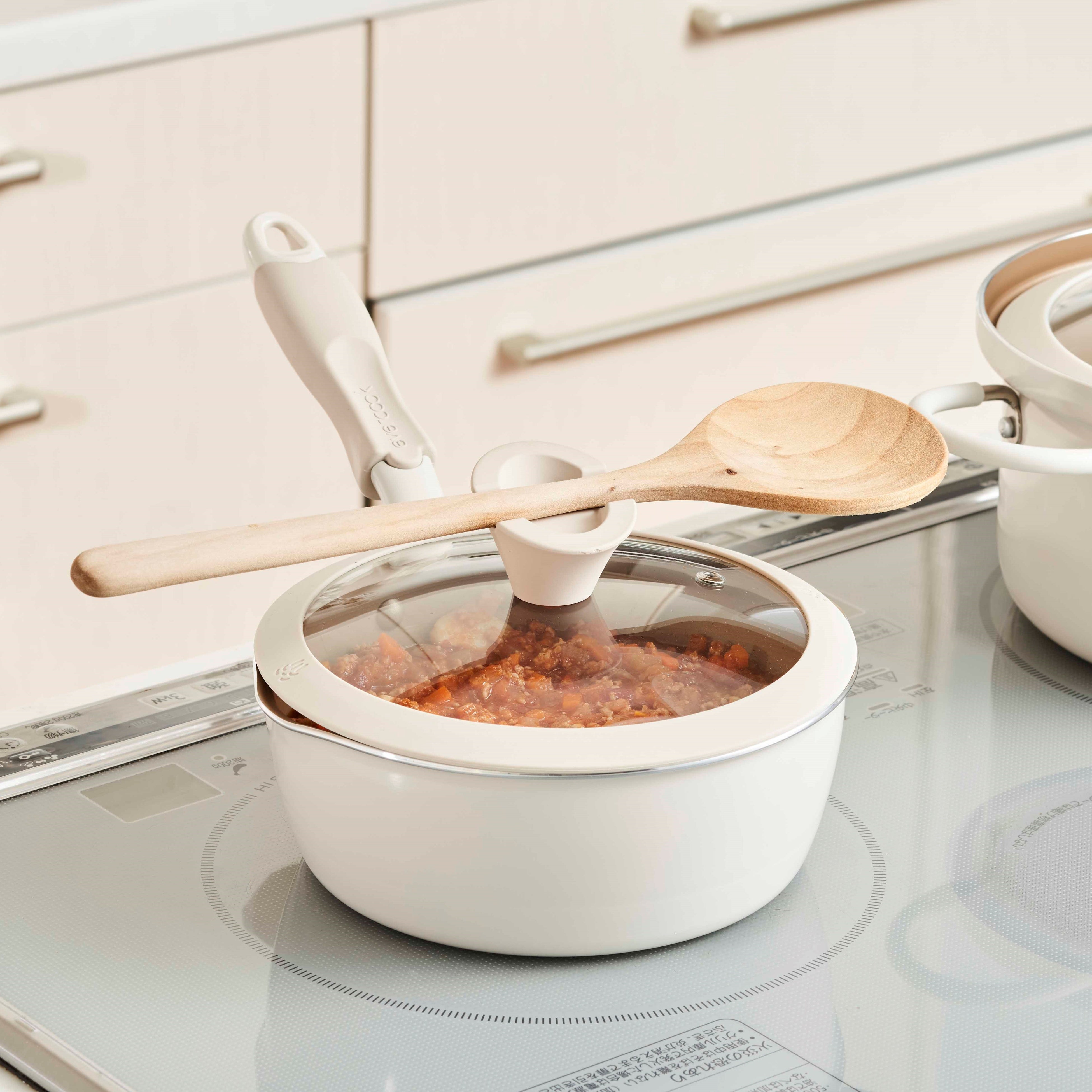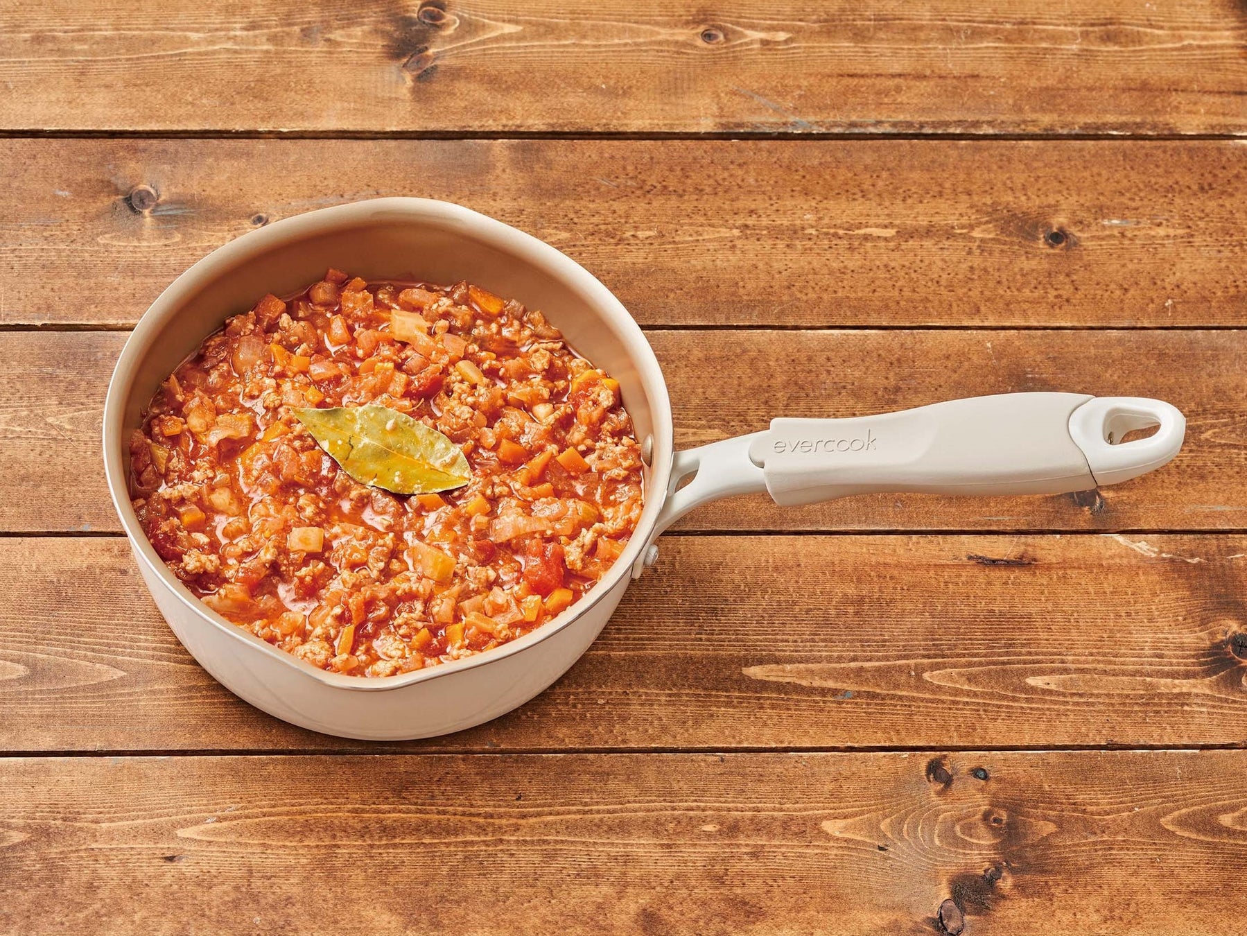 今回発売する「evercookマルチに使える鍋パン」はevercookの鍋シリーズ、卓上鍋、カレー・シチュー鍋に合わせたアイボリーカラーの万能な片手鍋です。焼く、炒める、といったフライパンとしての機能はもちろん、煮込む、茹でる、といった鍋としての機能も兼ね備えた、使いやすいサイズとなっています。