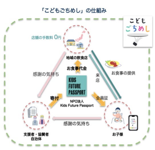「こどものために・未来のために。こどもと地域をつなぎ、ささえる」を理念として設立したNPO法人 Kids Future Passportが運営する、次世代型こども食堂です。当団体は、すべてのこどもの健やかな成長を見守る持続可能な仕組みで、隠れ貧困やこどもの孤食問題の解決を目指します。飲食店を利用することにより、こども食堂が直面する人手・資金・場所の問題をクリアし衛生面の心配も不要となり、運営を持続しやすいのが特長です。また、飲食店は登録料やシステム料など手数料なしで導入でき、売上を向上できるため、こどもの食事が地域活性化につながります。