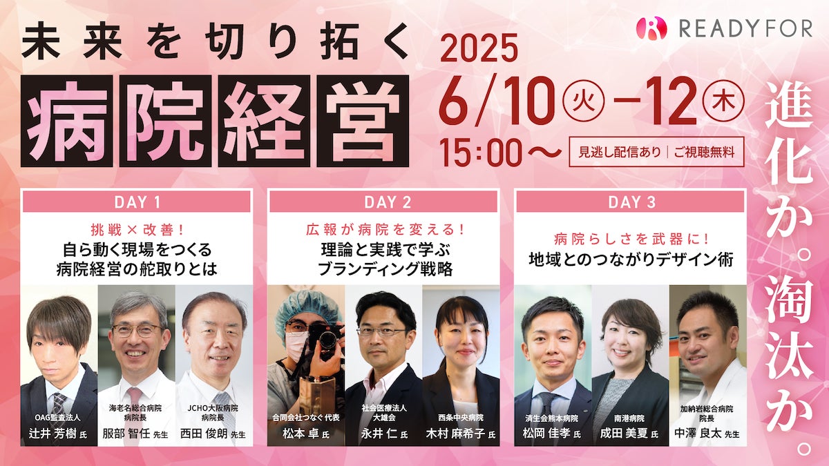 日本初・国内最大級のクラウドファンディングサービス「READYFOR」を運営するREADYFOR株式会社は、2025年6月10日(火)〜6/12(木)にみらい病院シンポジウムvol.3「ー進化か淘汰かー 未来を切り拓く病院経営」を開催いたします。