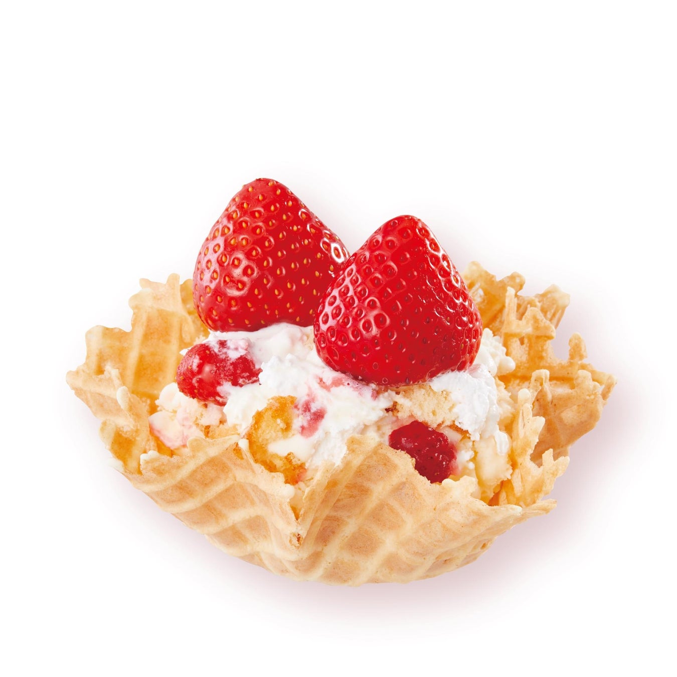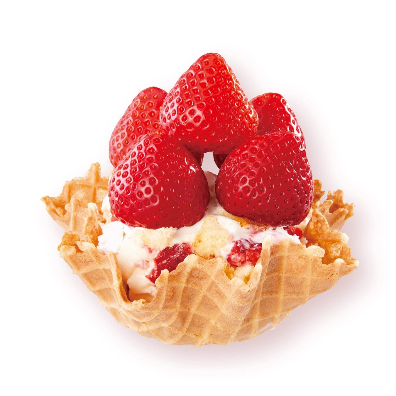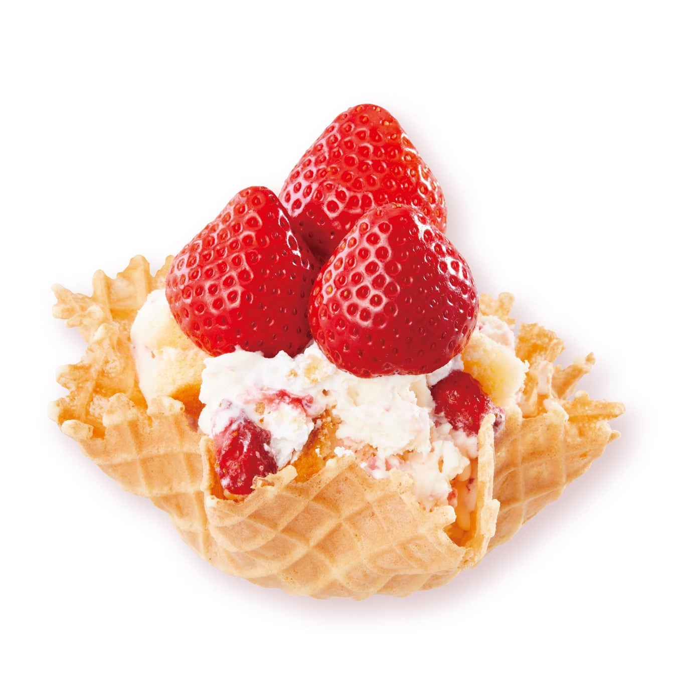 “あまおう” の甘みと酸味は、ミルキーなバニラアイスクリームとの相性が抜群。ミックスインのふわふわなスポンジケーキと、ダブルホイップクリームとともに果肉から果汁が溢れ出す贅沢な “あまおう” をご堪能ください。