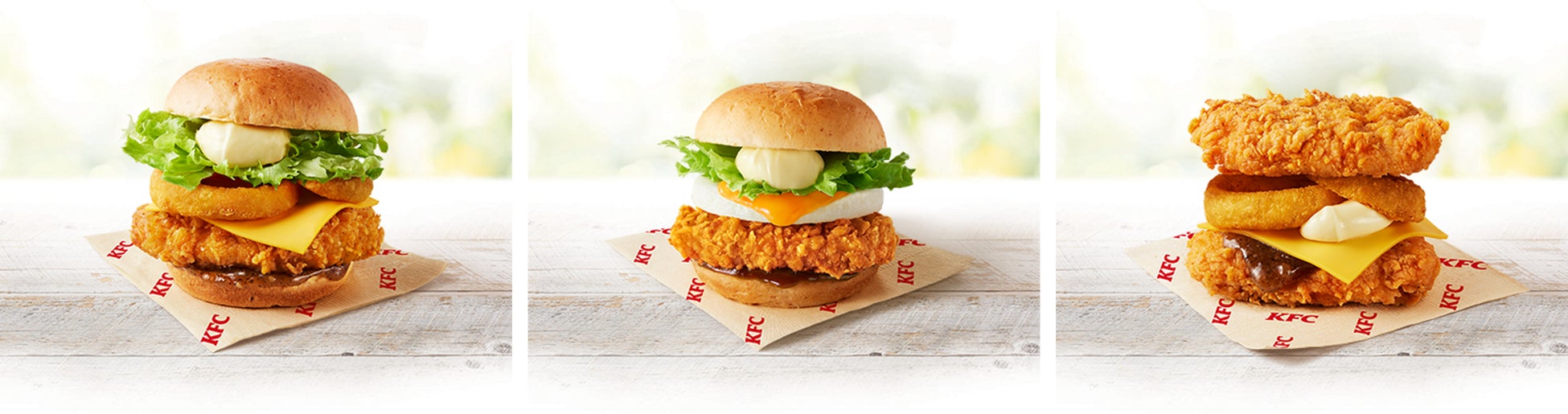 KFCから、アメリカンな味わいを存分に楽しめる「ザ・アメリカンバーガーズ」が登場! まずは「ガーリックソースのオニオンフィレバーガー」。KFC自慢のやわらかジューシーな「骨なしケンタッキー」に、サクサクのオニオンリングとガーリックソースを組み合わせた逸品です。アメリカ定番のオニオンリングが加わり、満足感たっぷりのバーガーに仕上がっています。そして、新登場の「ハニーBBQソースのエッグフィレバーガー」。こちらは、「骨なしケンタッキー」に、目玉焼き風オムレツとアメリカで人気のBBQソースを合わせたバーガー。秘伝の11種類のハーブ&スパイスで味付けされたチキンと、甘じょっぱいハニーBBQソースが絶妙にマッチ。目玉焼き風オムレツのとろ~り黄身ソースが加わり、一体感のある味わいが楽しめます。
