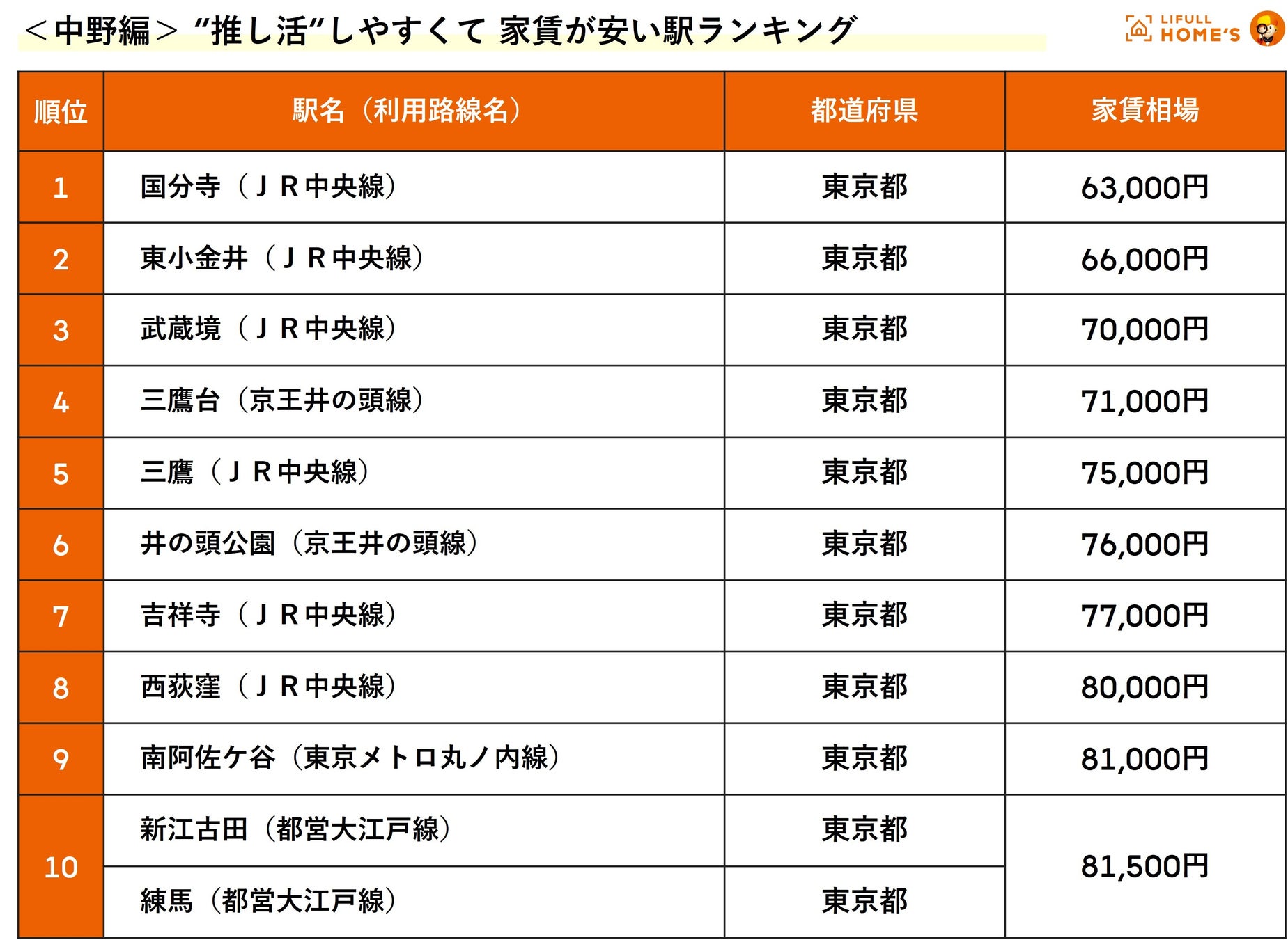 1位は「国分寺駅」(63,000円)がランクイン。JR中央線で中野にアクセスすることができます。同じくJR中央線沿線の駅からは2位「東小金井駅」(66,000円)、3位「武蔵境駅」(70,000円)、5位「三鷹駅」(75,000円)、7位「吉祥寺駅」(77,000円)、8位「西荻窪駅」(80,000円)がランクインしました。