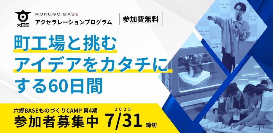 株式会社ツクリエ(本社:東京都千代田区 代表取締役:鈴木英樹 以下、ツクリエ)が東京都大田区から運営受託する六郷BASEは、2025年9月から、2カ月間でプロトタイプやビジネスモデルをブラッシュアップするアクセラレーションプログラム「六郷BASEものづくりCAMP」を開催します。
