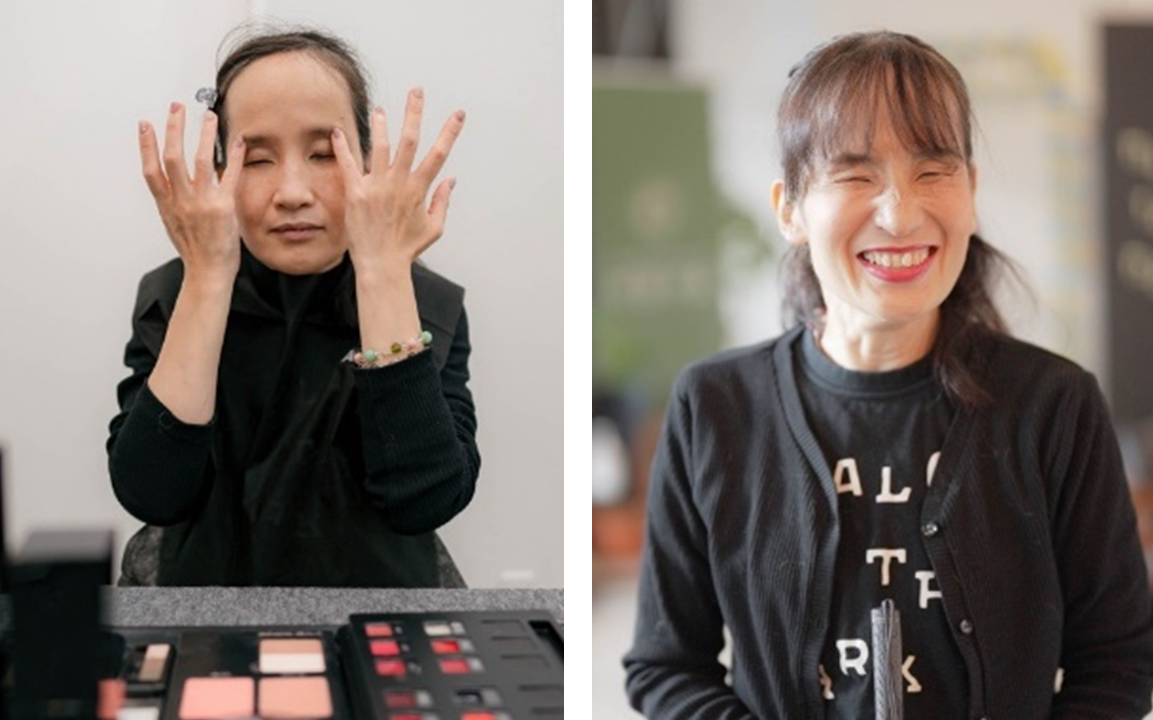 ファンデーションやアイブロー、アイカラーやチークなど、両手の指を左右同時に対称に動かすことで、左右のバランスが整いやすいメークメソッドを開発。肌色やなりたいイメージに合わせたメークを行いました。