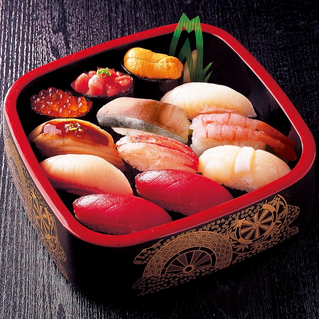 【商品内容】 冬の旬ネタ5貫<寒ぶり・寒平目・ときさば〔〆さば〕・ほたて・ずわいがに>、まぐろ赤身、中とろ、生うに、いくら、落ちとろ、柚子ふり穴子、甘海老