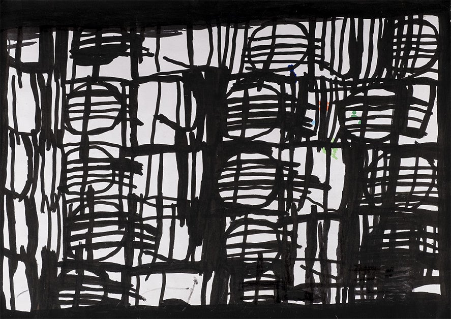 学校に行けず暇を持て余していた時期に、作家の母が「マルを描いて」と紙とペンを渡したのが創作のはじまり。マルというモチーフが彼女のなかでピタリとはまり熱中するようになる。マルを描き始めて5年になるが、近年はマル以外のモチーフも描くようになり、マル、サンカク、シカクのモチーフを大きなカンバスに日々飽きることなく描き続ける。コミュニケーションとして発する言葉はわずかだが、頭に浮かんだであろう言葉を繰り返し呟き、言葉と一緒に作品が生まれることもある。
