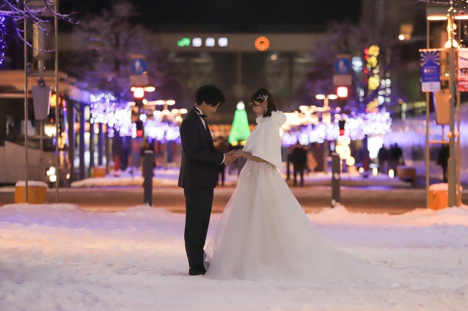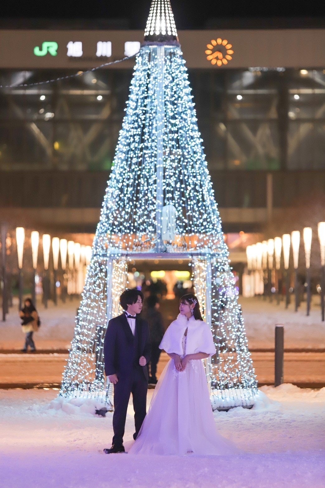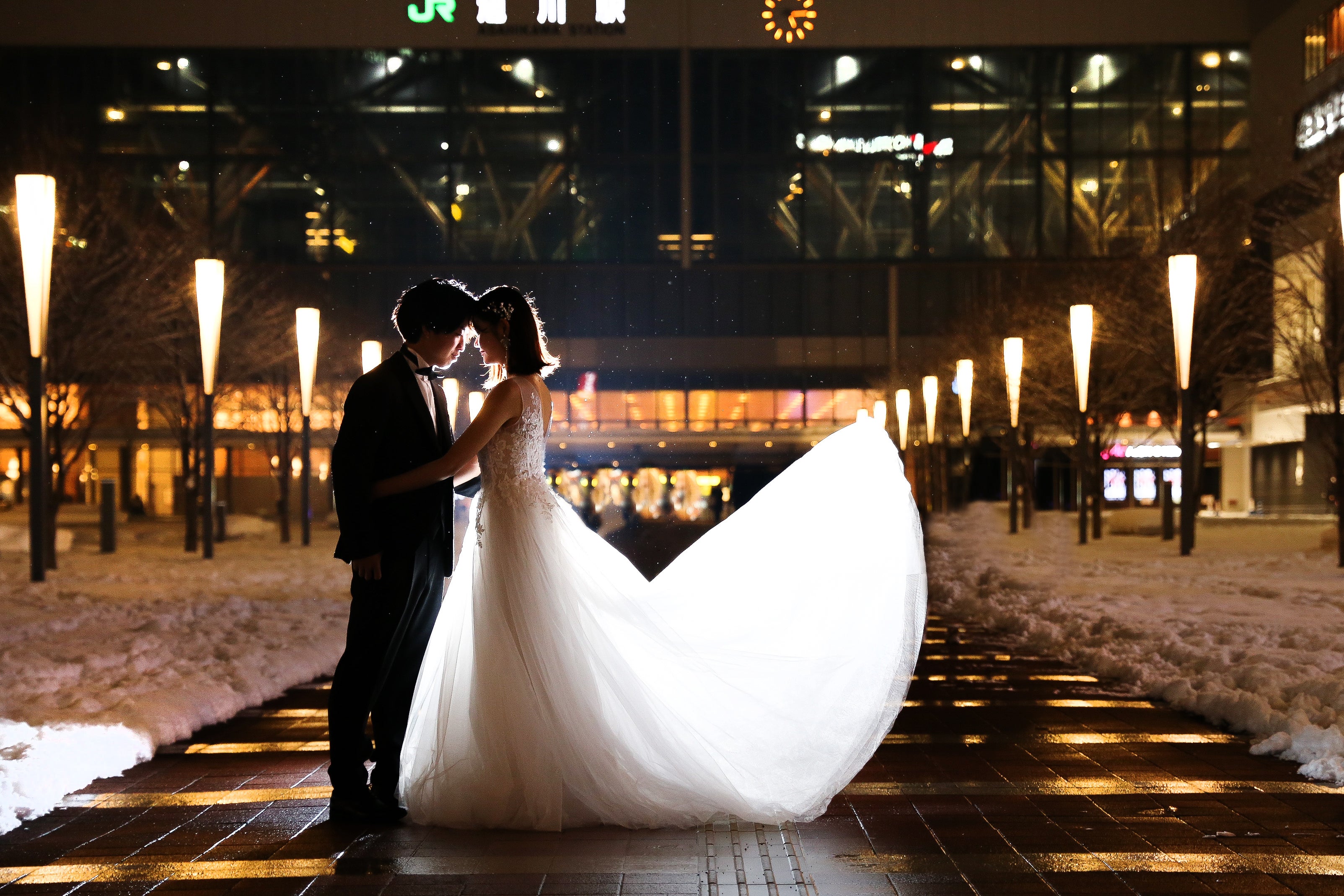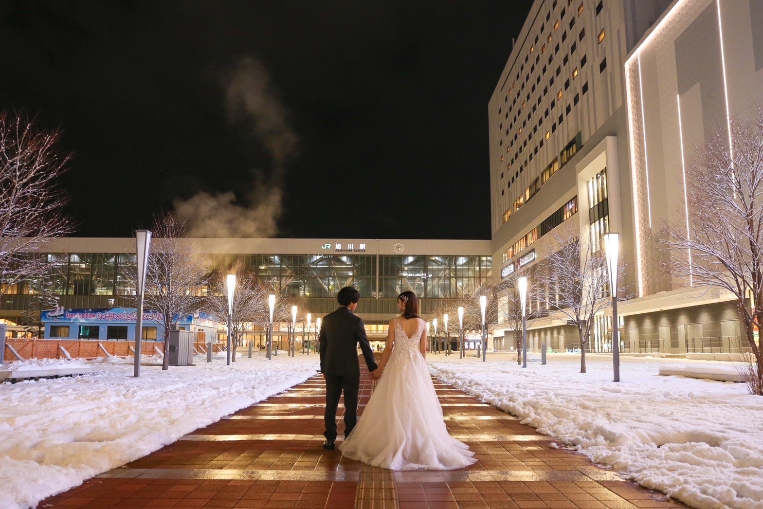 JR旭川駅でのフォトジェニックな『旭川駅ナイトロケーションフォトウェディング』をご提案いたします。