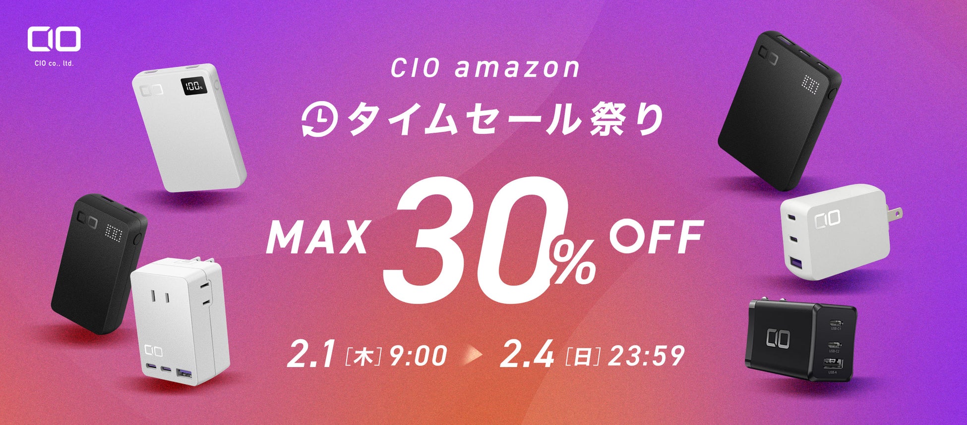 小型・高出力のモバイルバッテリー「SMARTCOBY」シリーズや、小型のGaN急速充電器「NovaPort」シリーズなどを展開する株式会社CIOは、「2月 タイムセール」に、売れ筋人気製品や新商品を最大30%OFFにて販売いたします。