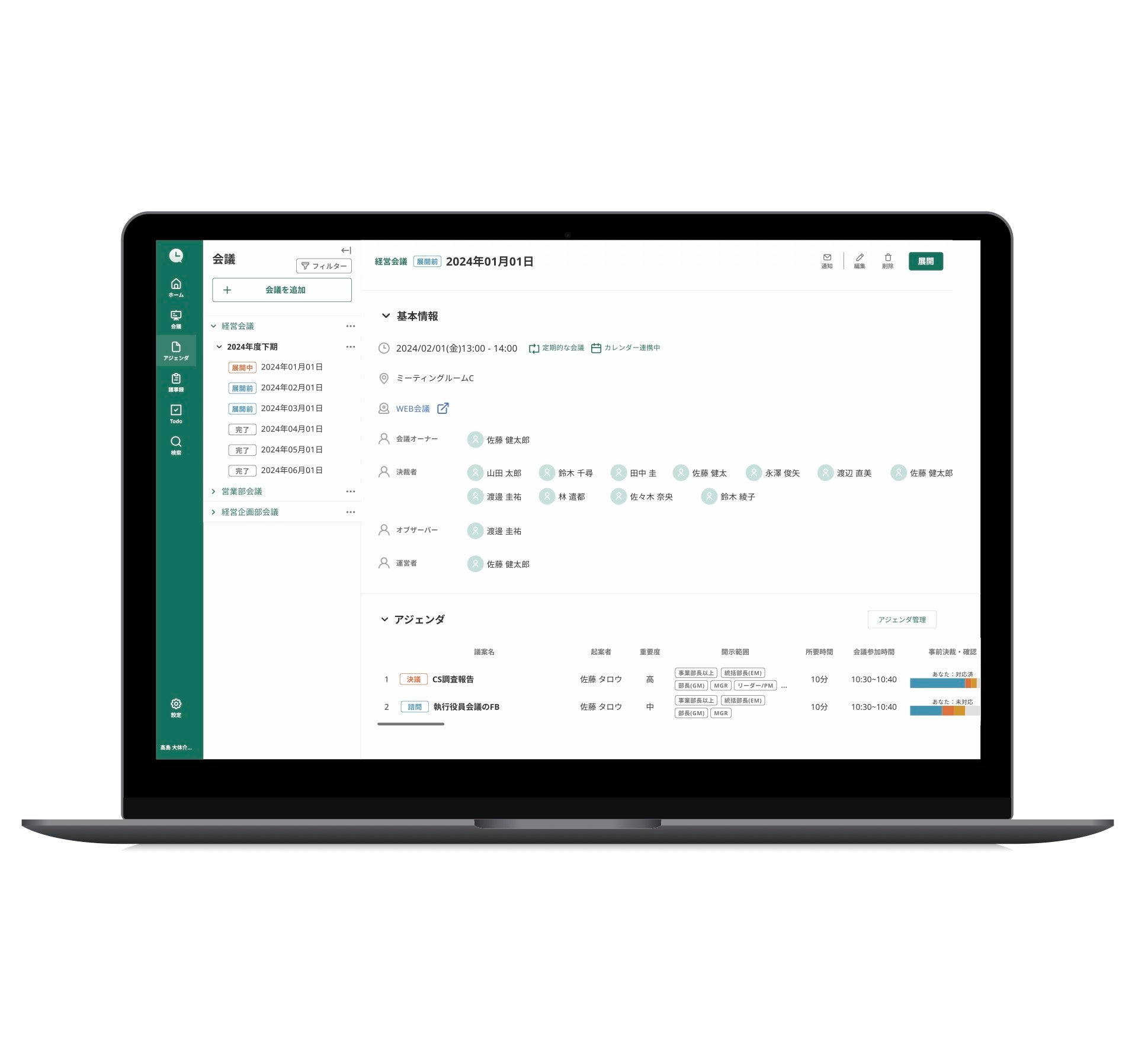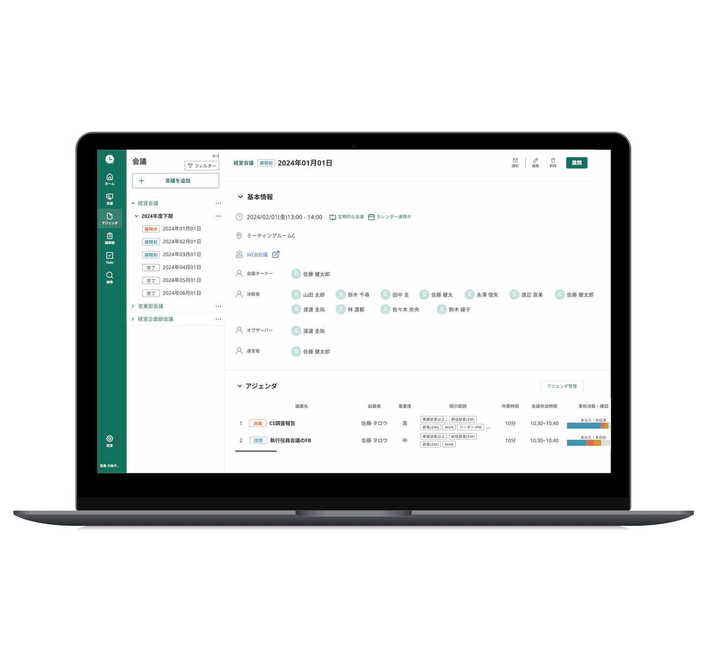 「TIMO Meeting」は、理想の会議運営を効率的に実現する経営会議の管理ツールです。会議前の設定から会議後のToDo管理までミーティングマネジメントに関わる全ての機能を補っており、自社の求める最適な会議運営を実現します。運営工程を自動化、会議情報を資産化、議題の状況と理解度向上を実現し、議論の活性化・会議時間の削減につなげます。