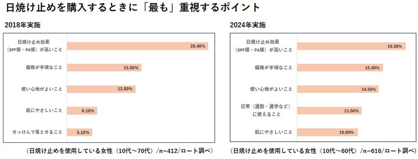 2018年と2024年の「日やけ止め」調査結果を比較したところ、女性が日やけ止めを選ぶ際に重視するポイントが多様化していることがわかりました。「日やけ止め効果」だけでなく、「使い心地」、「肌への優しさ」、「日常使用の利便性」など、さまざまな要素が重視されるようになっています。