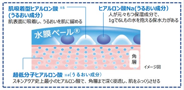 ※3:ヒアルロン酸(うるおい成分)配合の日やけ止めを塗りなおすことで、ヒアルロン酸を補給する、※4:加水分解ヒアルロン酸、※5:ヒアルロン酸ヒドロキシプロピルトリモニウム※6:ビスエチルヘキシルオキシフェノールメトキシフェニルトリアジン、シリカ(UVカット成分)