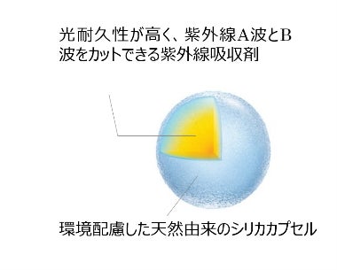 環境に配慮した天然由来成分のシリカカプセルに、紫外線のA波からB波まで幅広い紫外線をブロックし、紫外線などの光によるUVカット機能の低下が起こりにくい成分を配合しました。