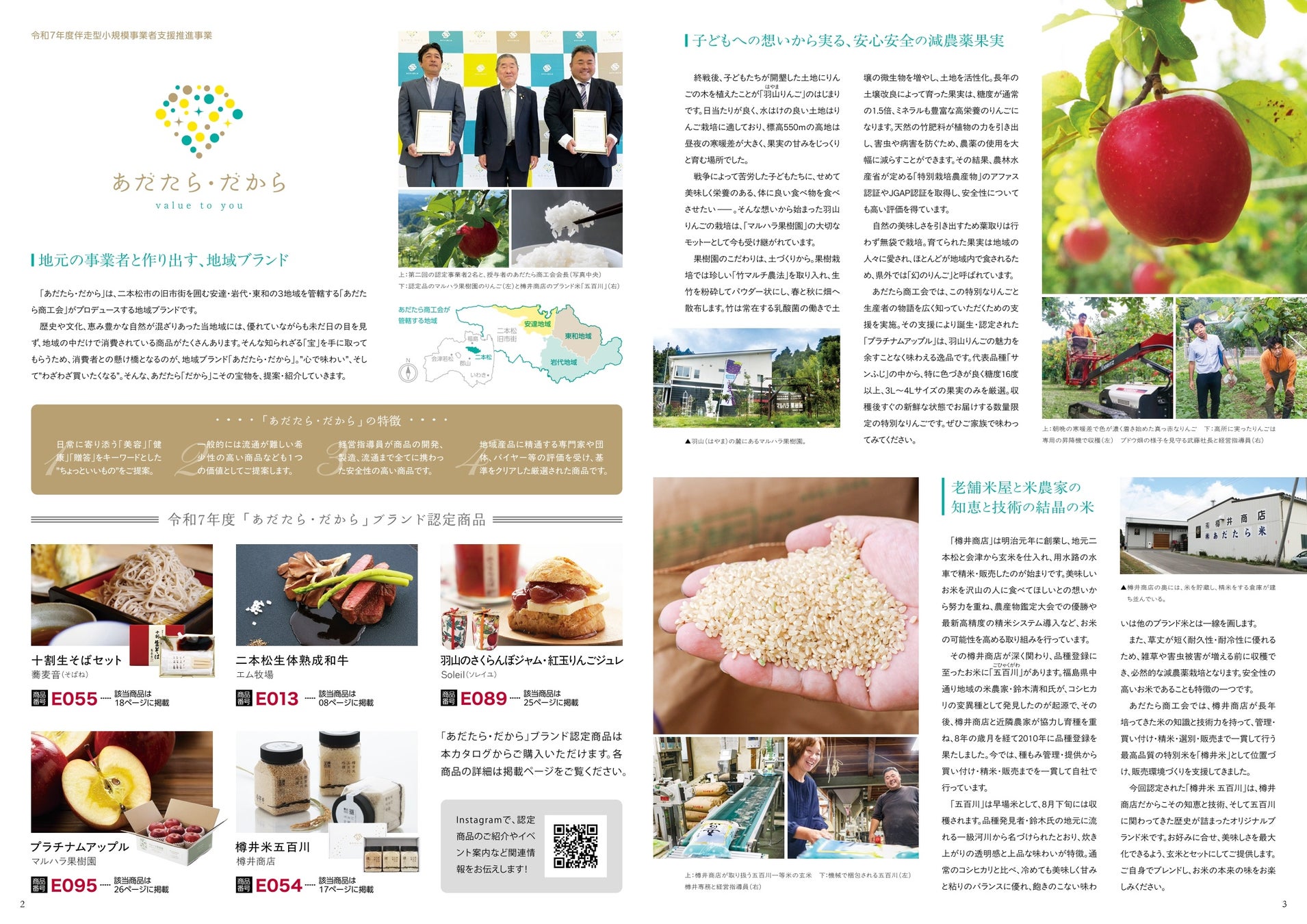 巻頭では、二本松市の安達・岩代・東和の3地域を管轄するあだたら商工会がプロデュースする地域ブランド「あだたら・だから」を特集。「あだたら・だから」は、あだたら商工会が「美容」「健康」「贈答」をコンセプトに、事業者と共に商品の開発・リブランディングを行い、「安心」「安全」で「信頼性」ある唯一無二の商品をご提案するブランドです。さらに、商品を通して、作り手の想いや開発エピソードなどあだたら地域の風土が創り上げたストーリーを知って楽しんでいただくことを目的としています。特集ページでは、令和7年度認定商品に加え、商品に込められた想いやこだわりを紹介するコラムを掲載。あだたら「だから」こその魅力をお届けいたします。