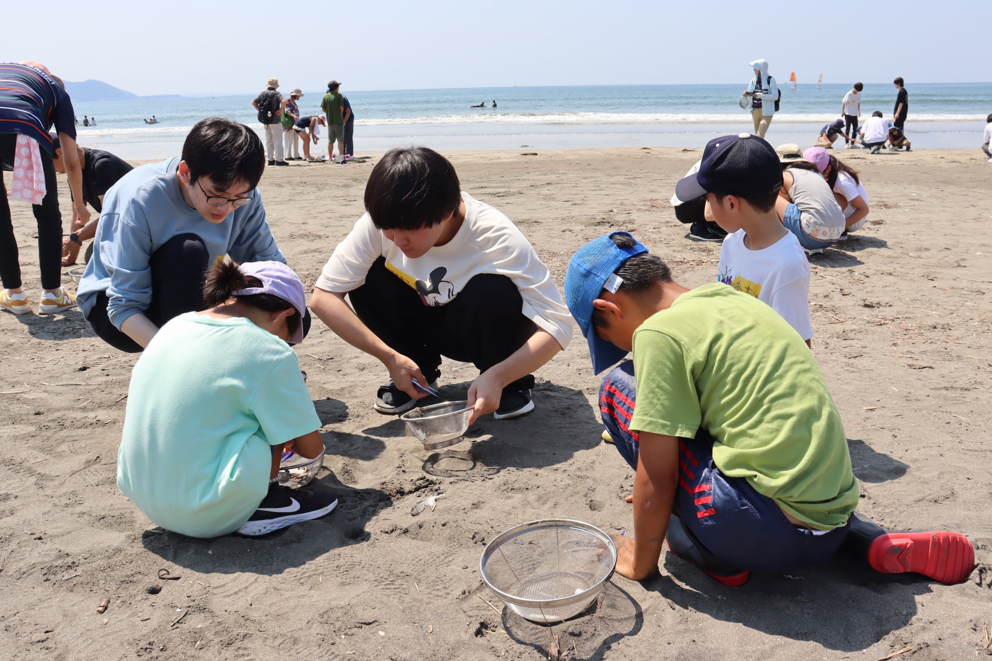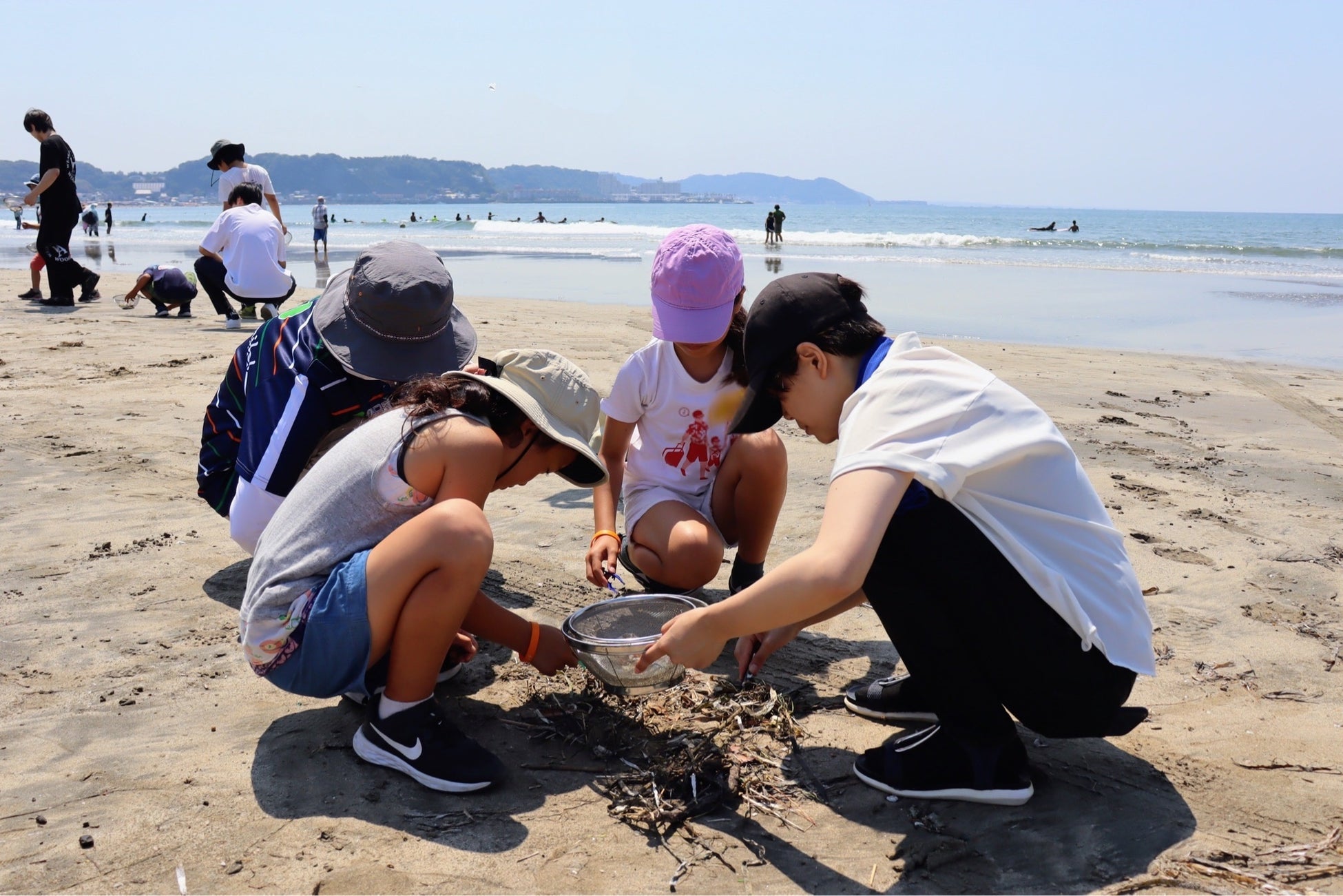 午前中、鎌倉市の学童クラブ「放課後かまくらっ子いなむらがさき」を利用する小学1~5年生の児童12人が由比ヶ浜海岸に集まりました。児童らは神奈川工科大のお兄さん・お姉さんたちと一緒に、大小さまざまなプラスチックごみを拾い集めました。一見綺麗に見える海岸も、ザルやピンセットを使ってよく探してみるとたくさんのごみが見つかります。