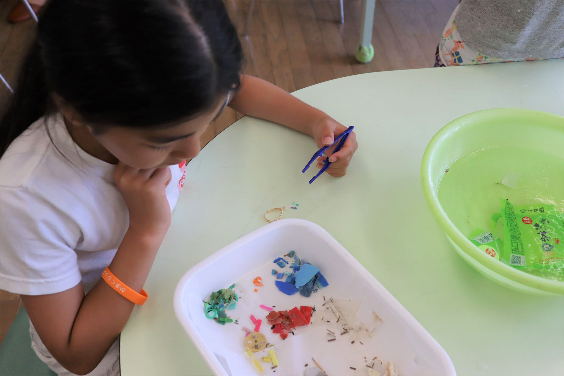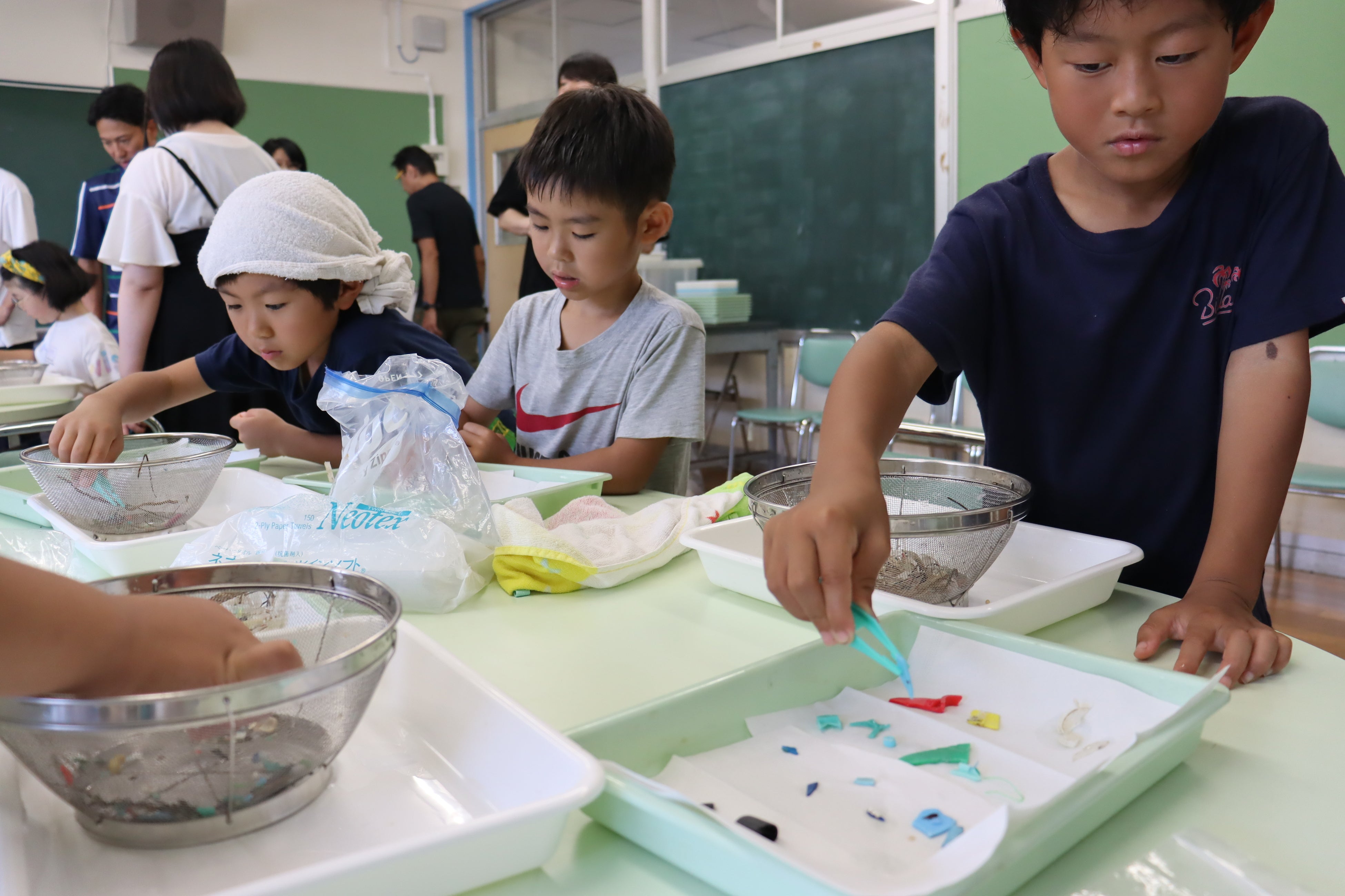 児童からは「意外とごみが多くてびっくり」「マイクロプラスチックごみはアリよりも小さくて見つけるのが大変」などの声が。みんなザルにいっぱいのごみを回収し、学童クラブに持ち帰りました。