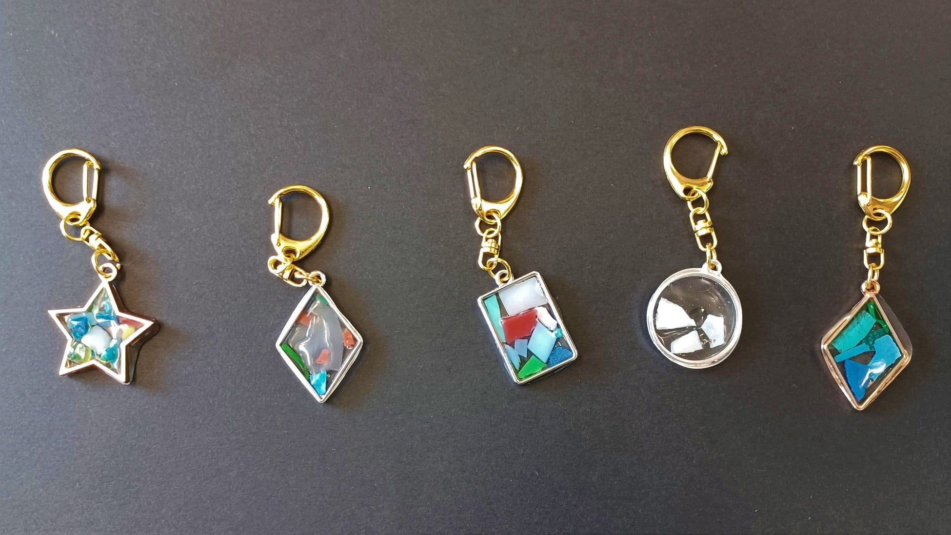 敷き詰め終わったら、レジンを流し込んでUVライトで固めると、色とりどりのキーホルダーができあがりました。プラスチックごみがオリジナルの素敵なキーホルダーに変わったことに、児童たちはとても嬉しそうでした。