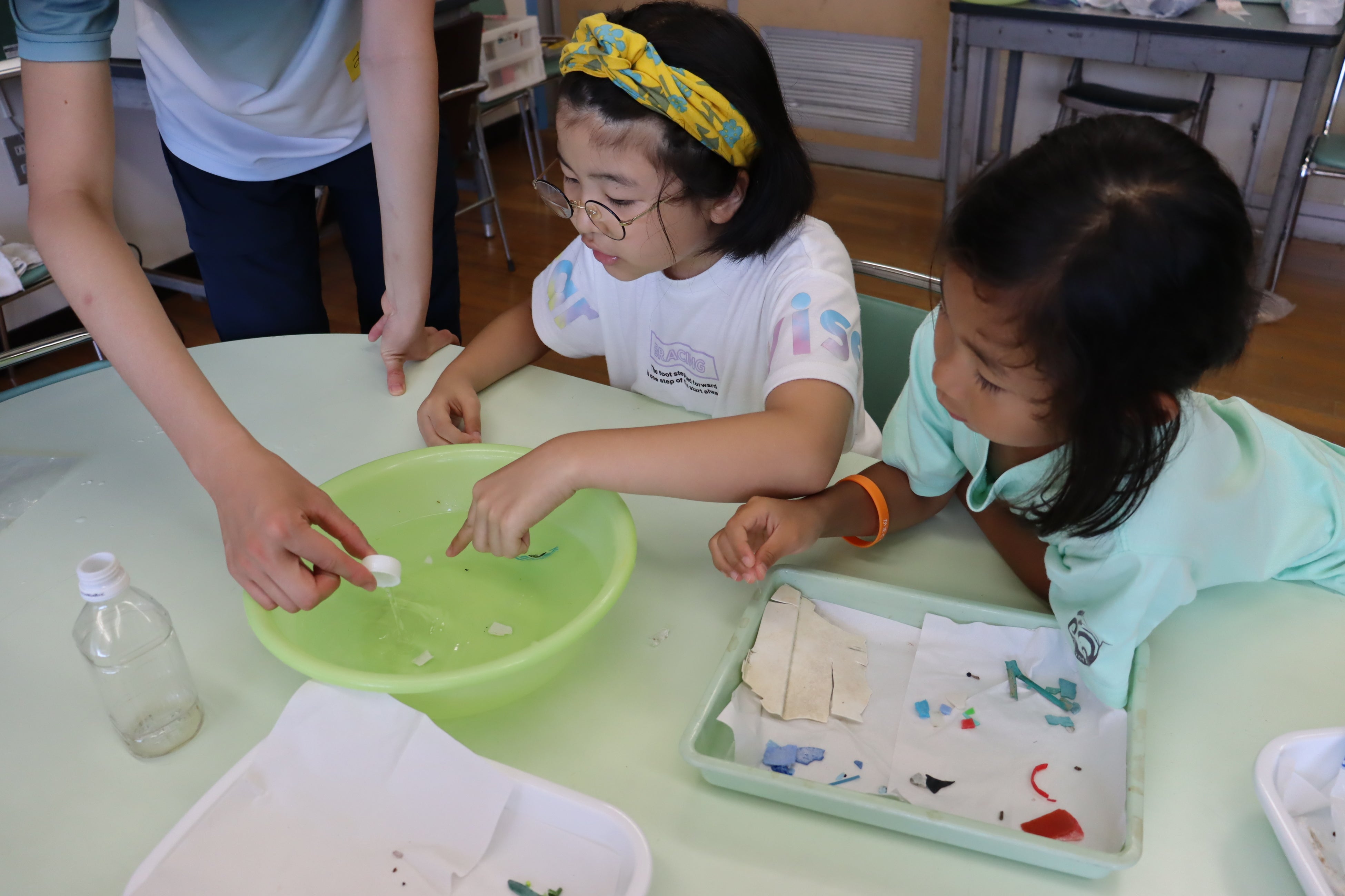 その後、児童たちはプラスチックごみの破片を使って工作を行いました。星やダイヤなど好きな型を選び、その中にプラスチックごみを敷き詰めていきます。色や形の組み合わせにこだわりながら一生懸命敷き詰めていく様子が印象的でした。