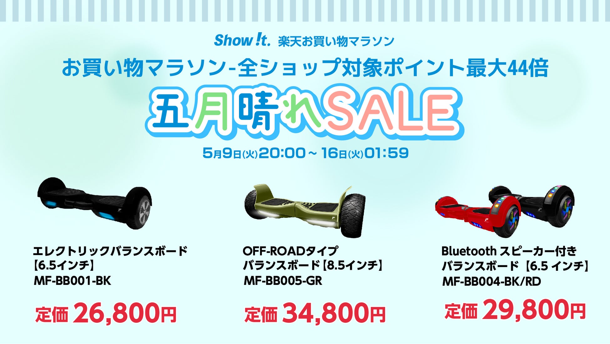 楽天市場「Show !t」は5月9日(火)20:00~5月16日(火)01:59までまで電動バランスボードご購入で12,000円相当のキッズプロテクターもしくはヘルメットと収納バッグ、さらにアウトドアやレジャーに便利な防水バッグをプレゼントとなる、お得なMEISTER.F電動バランスボードセットを販売します。