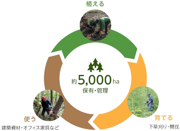 当社グループは、「&」マークに象徴される「共生・共存」「多様な価値観の連繋」「持続可能な社会の実現」の理念のもと、グループビジョンに「&EARTH」を掲げ、社会・経済の発展と地球環境の保全に貢献しています。この保全活動の一環として、北海道に約5,000ha(東京ドーム約1,063個分)の森林を保有し、持続可能な“終わらない森”創りに向けて、「植える」「育てる」「使う」のサイクルをまわしています。