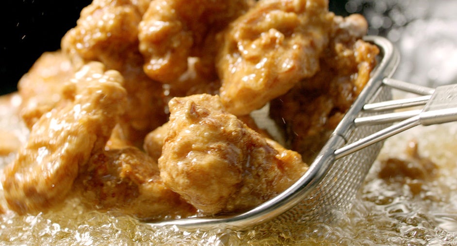ジューシーに仕上げる為、バッターを鶏肉によく絡ませ、揚げています。その事によって、衣が鶏肉をコーティングし、肉汁を閉じ込めます。