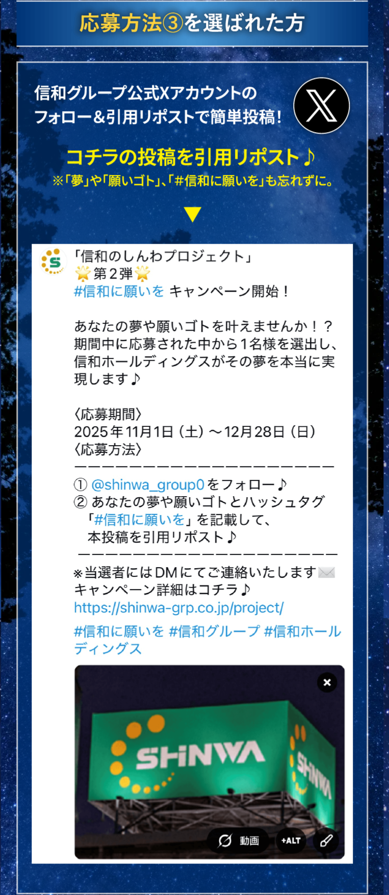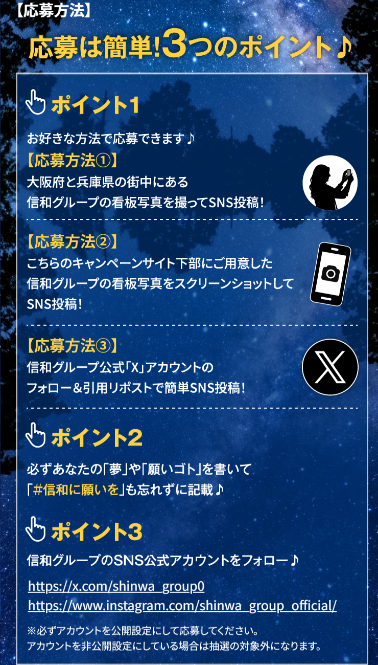 ②自身の「夢」や「願いゴト」の内容(理由を含む)とともに、Instagram または X(旧Twitter)にて「#信和に願いを」のハッシュタグをつけて投稿