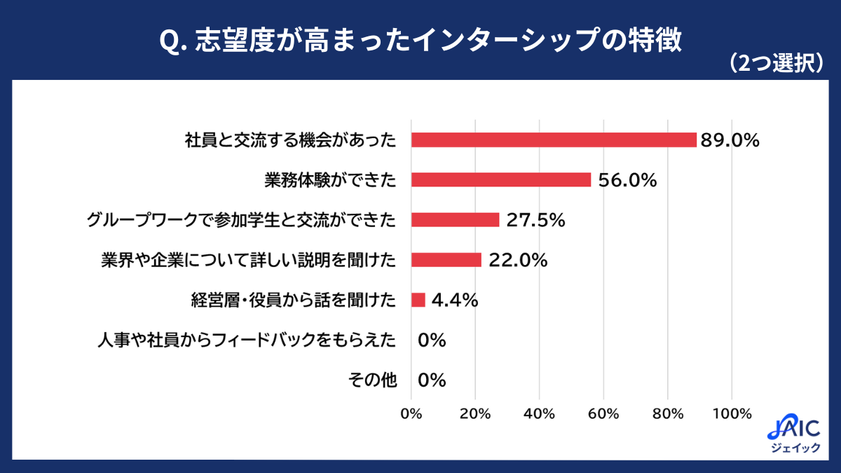 インターンシップを通じて「志望度が高まった」と回答した学生に、「志望度が高まったインターシップの特徴として、あてはまるものをふたつ選択してください」と質問したところ、「社員と交流する機会があった」が89.0%、「業務体験ができた」が56.0%、「グループワークで参加学生と交流ができた」が27.5%、「業界や企業について詳しい説明を聞けた」が22.0%、「経営層・役員から話を聞けた」が4.4%、「人事や社員からフィードバックをもらえた」「その他」がそれぞれ0%となりました。