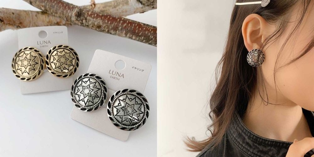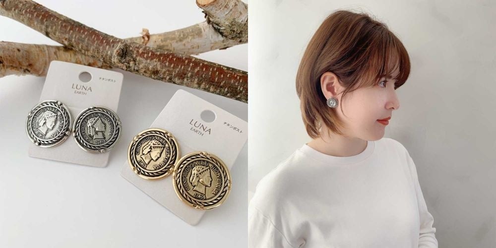 ピアスはコインのようなデザインとなっており、イヤリングはボタンのようなデザインに。