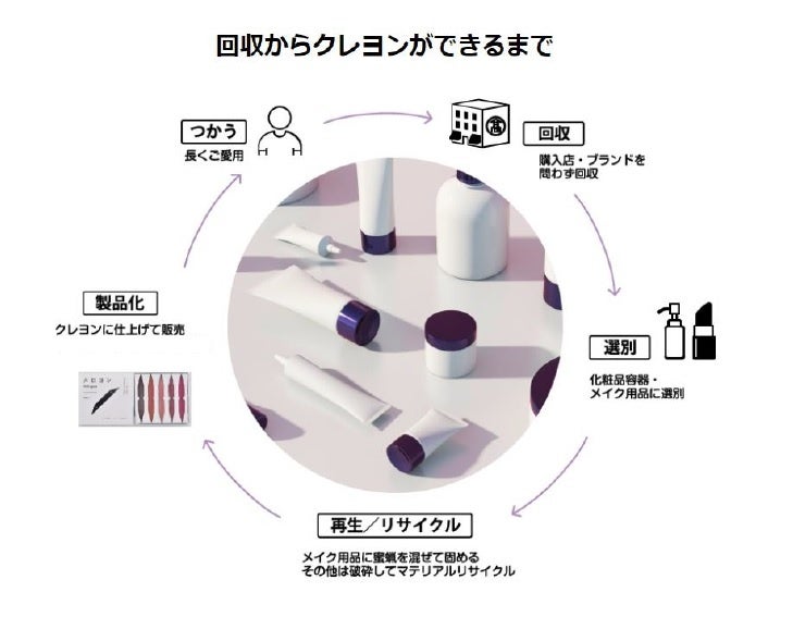 回収したメイク用品は、アップサイクルプロジェクト「COSME no IPPO」(※)を通して、2023年夏以降に「クレヨン」として生まれ変わり、髙島屋でお披露目いたします。回収した空容器は、「ECOMMIT」(※)のリサイクルスキームを通してマテリアルリサイクルを行いす。