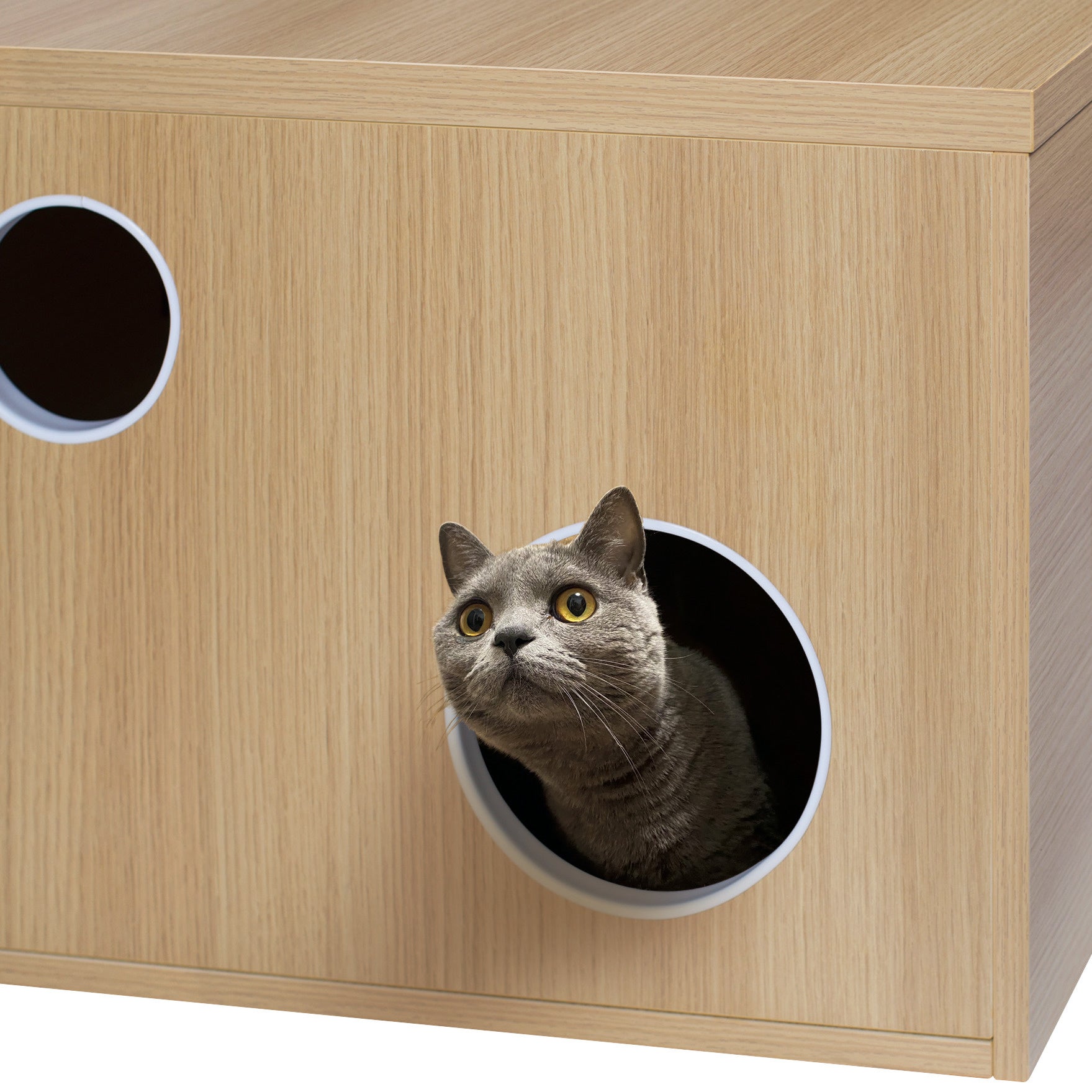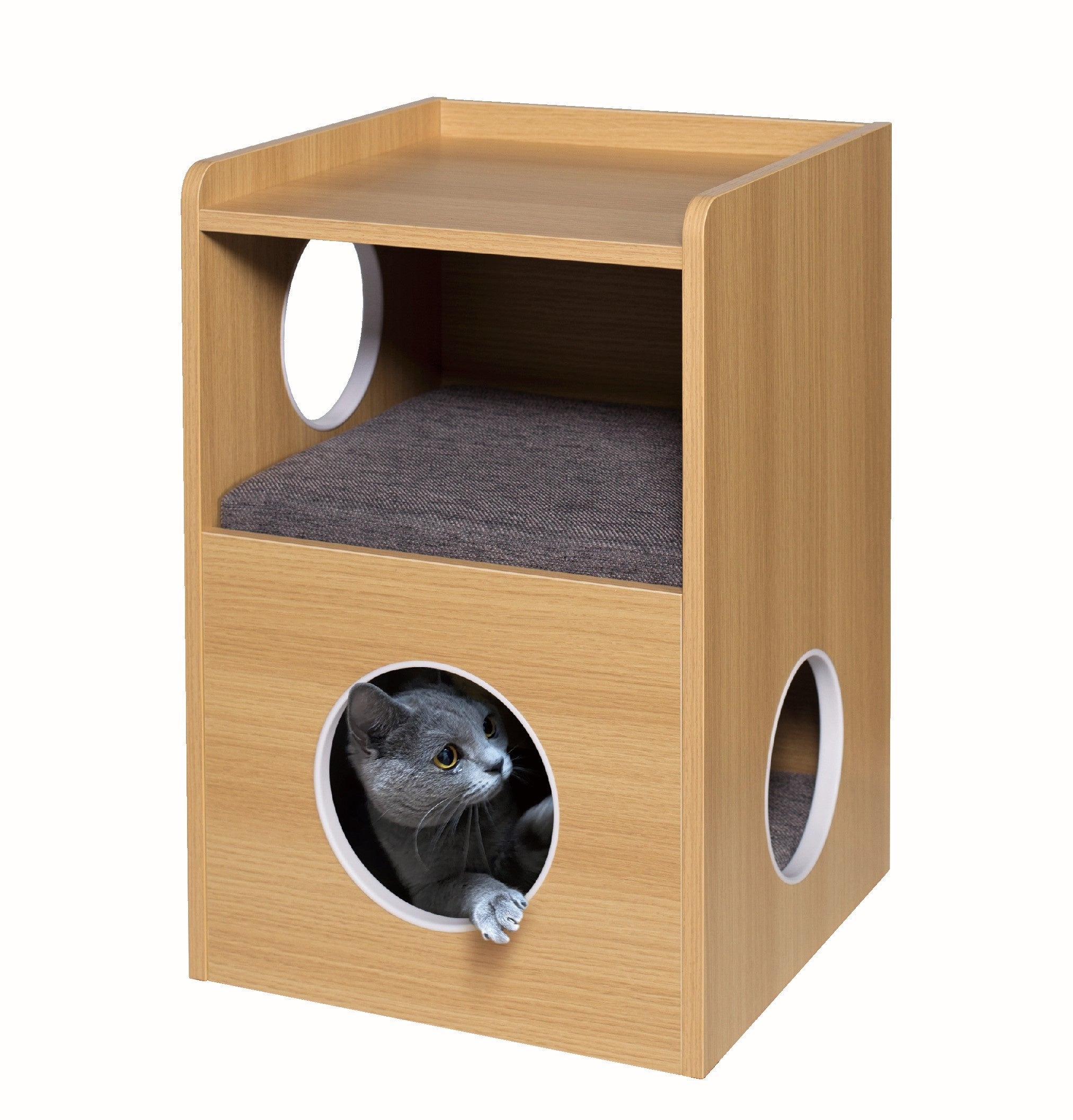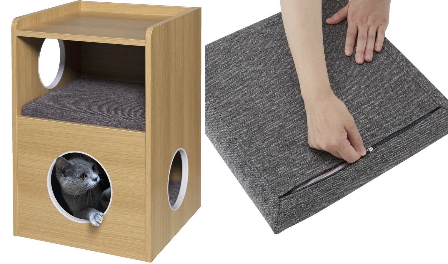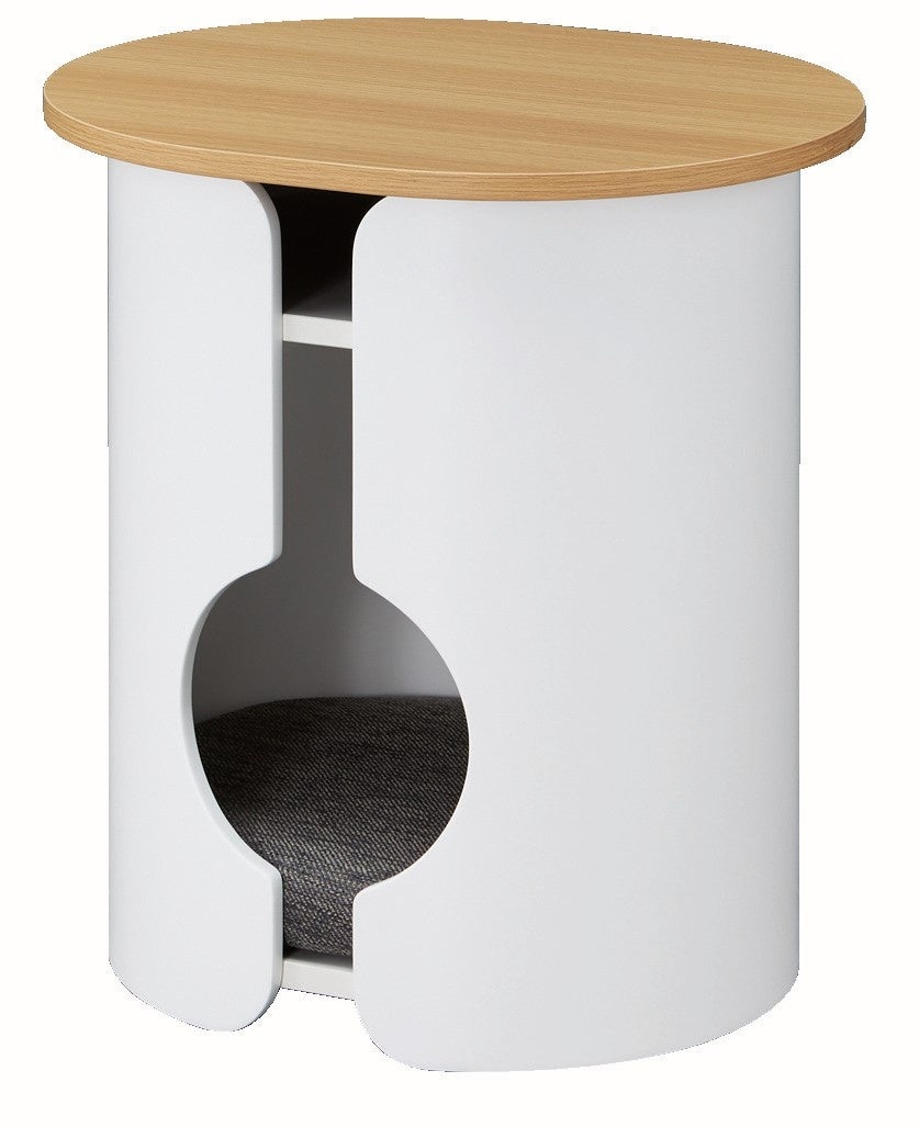 下段に、カバーを外せて洗えるクッション付きです。クッションカバーは、ひっかきキズ、汚れに強い生地を採用。天板下には小物を収納できるスペースがあり、ペット用のトリミングアイテムやおやつなどの収納としてもご使用いただけて便利です。また、天板下のスペースに付属のクッションを入れ込めば、上段がペットベッドに早変わり。使い方様々な、ペットも喜ぶサイドテーブルです。