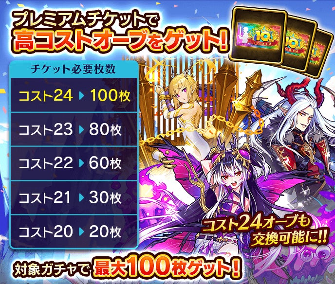 10周年記念ガチャで獲得できる「プレミアムチケット(オーブ)」を集めることで、「プレミアムチケット交換所」にてコスト20〜24までの好きなオーブ(一部限定系を除く)と交換することができます!