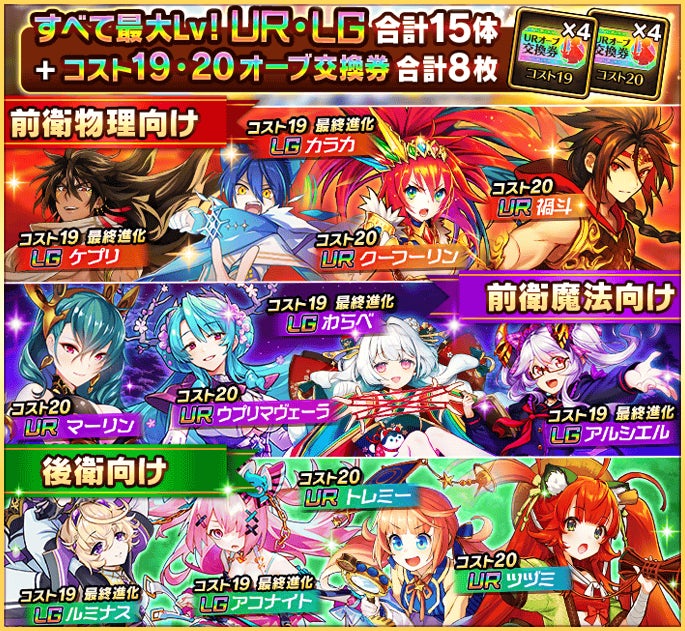 前衛物理・前衛魔法・後衛別のスターターデッキセットをご用意いたしました。バトルで即戦力になる強力なオーブが合計15体に加え、「URコスト20オーブ交換券×4枚」「URコスト19オーブ交換券×4枚」がセットになっている非常にお得な商品を期間限定で販売いたします。