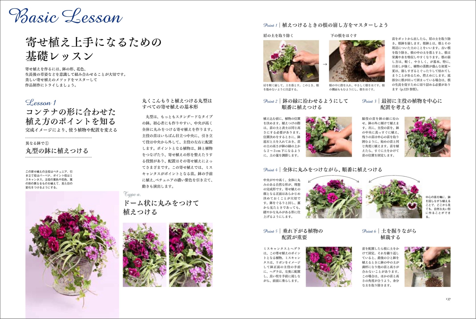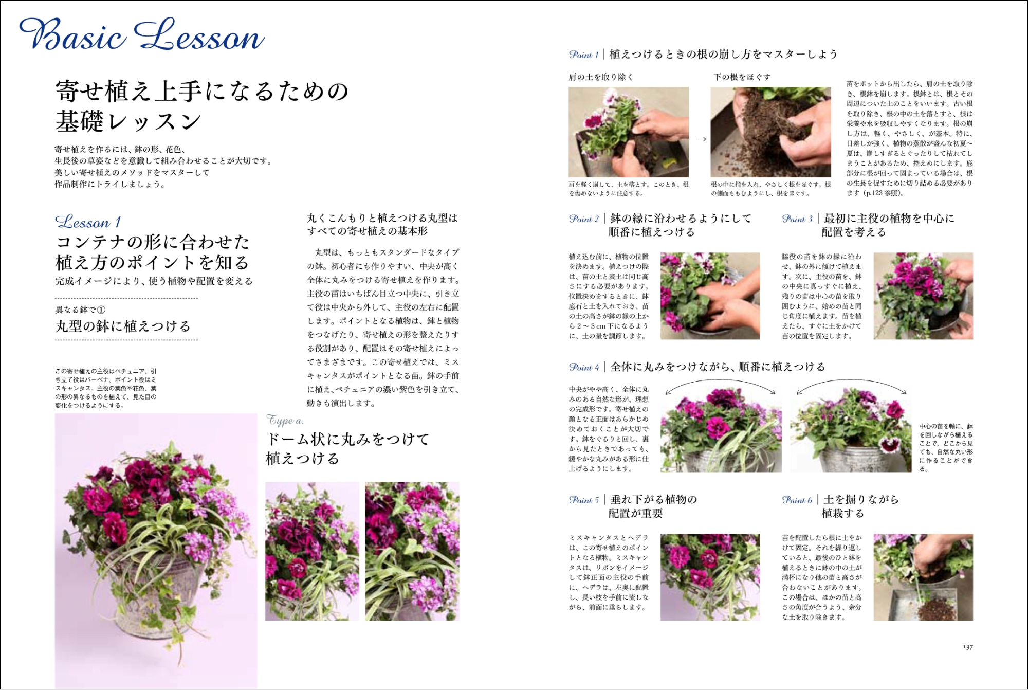 ・kentaro's style01~12/1~12ヶ月の寄せ植えの作り方[それぞれパターンa~c] ・寄せ植え上手になるための基礎レッスン[レッスン1:コンテナに合わせた植え方のポイントを知る/レッスン2:コンテナの違いで雰囲気が変わる/レッスン3:苗の選び方が上手になるには/レッスン4:カラーコーディネートをセンスアップする/レッスン5:苗の特長で選ぶテクニック/レッスン6:多肉植物の寄せ植えのコツをつかむ] ・寄せ植えの管理術を知る ・寄せ植えづくりの道具 ・寄せ植える鉢について ・美しい寄せ植えづくりの秘訣とは