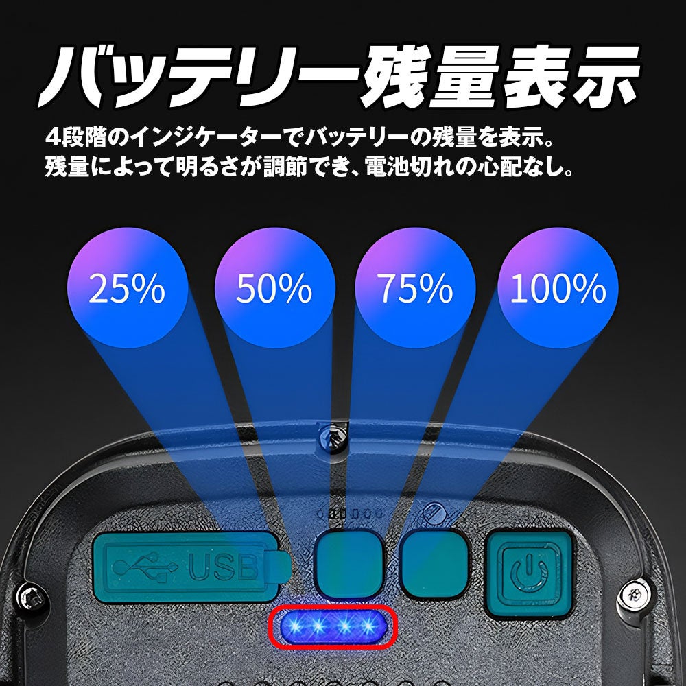 4段階のインジケーター(25%-50%-75%-100%)でバッテリーの残量を表示します。バッテリー残量が分かりやすく、残量によってライトの明るさが調節でき、電池切れの心配がなくなります。