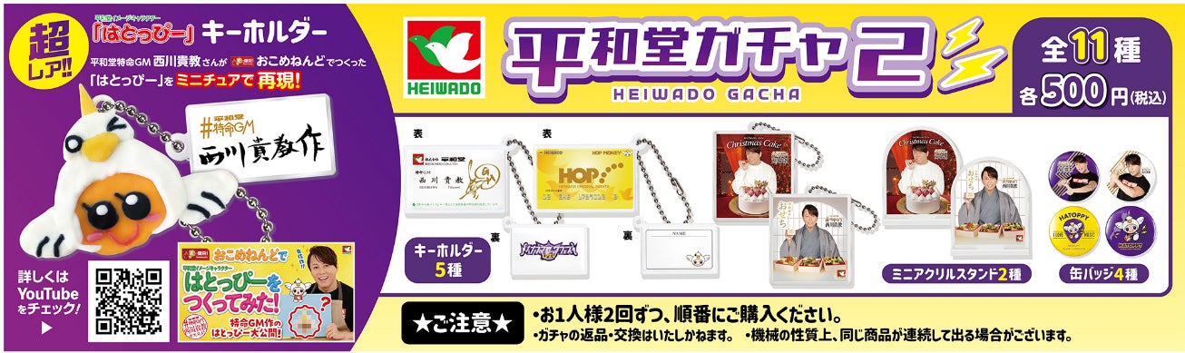 新しいデザインが加わりさらにパワーアップした「平和堂ガチャ2」が登場します。平和堂公式YouTube企画のなかで、平和堂特命GM西川貴教さんがE-WA!おこめねんどでつくった「はとっぴー」を、リアルにミニチュアで再現した「はとっぴー キーホルダー」をはじめ、アクリルスタンドや缶バッジなど全11種を販売します。