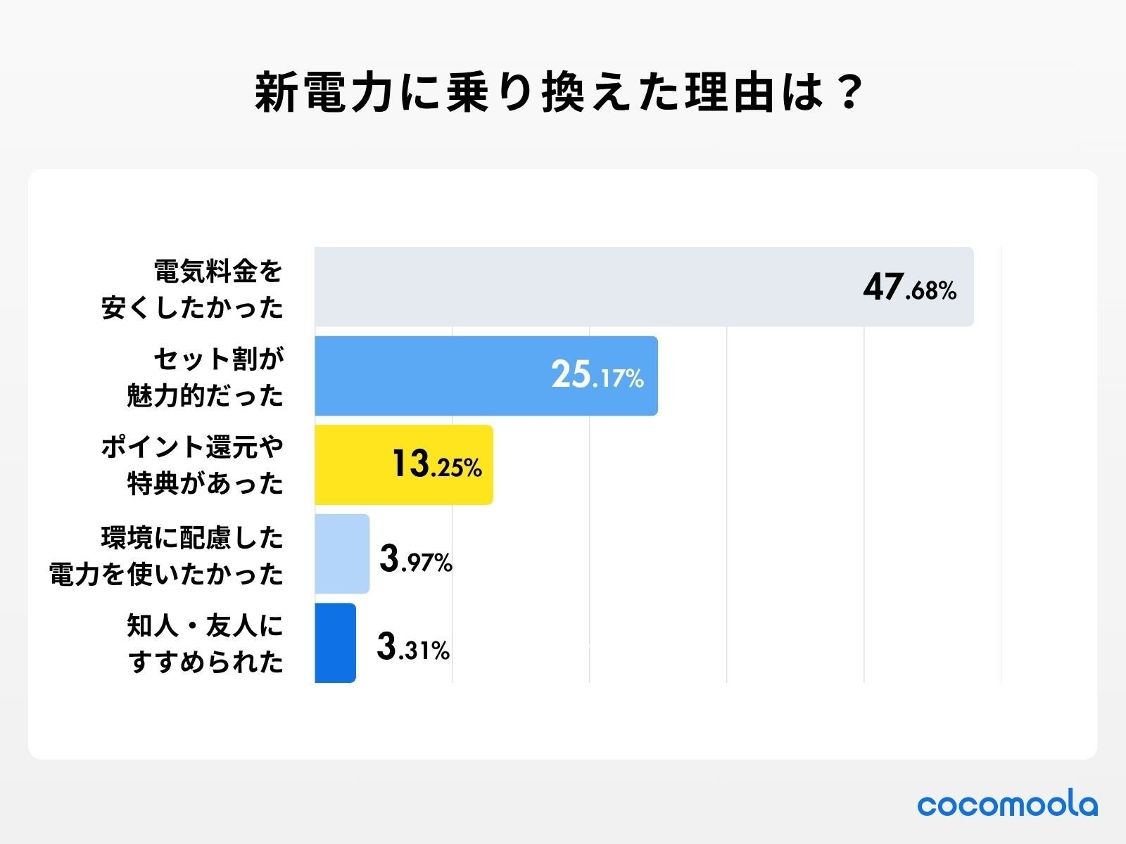 乗り換えの理由と、乗り換える電力会社を選ぶ際に最も重視したポイントのどちらも「電気料金を安くしたかった」(47.68%)、「電気料金の安さ」(56.95%)がトップとなり、利用者の最大の動機が電気代の節約にあることが明確になった。