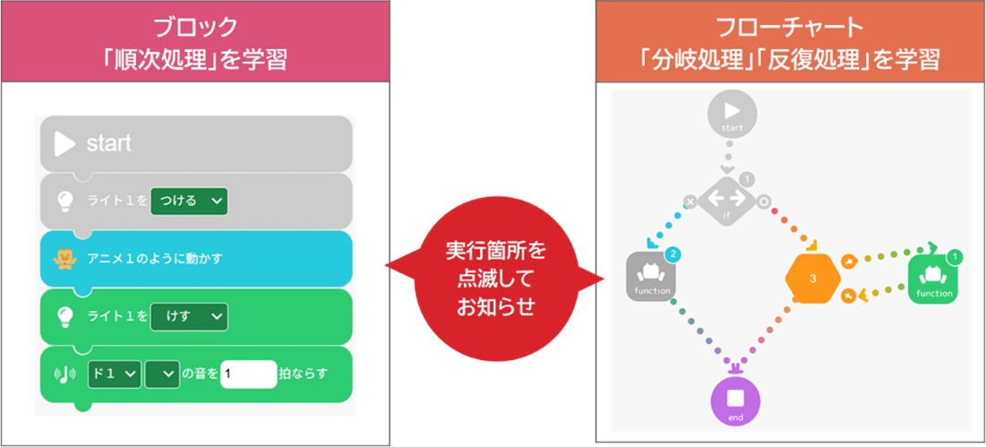 スマートフォン/タブレットで利用できる無料アプリです。ブロック式とフローチャート式の2種類のインターフェースを備えており、フローチャート式のプログラミング教材アプリは少なく、教育関係者からも高評価を得ています。