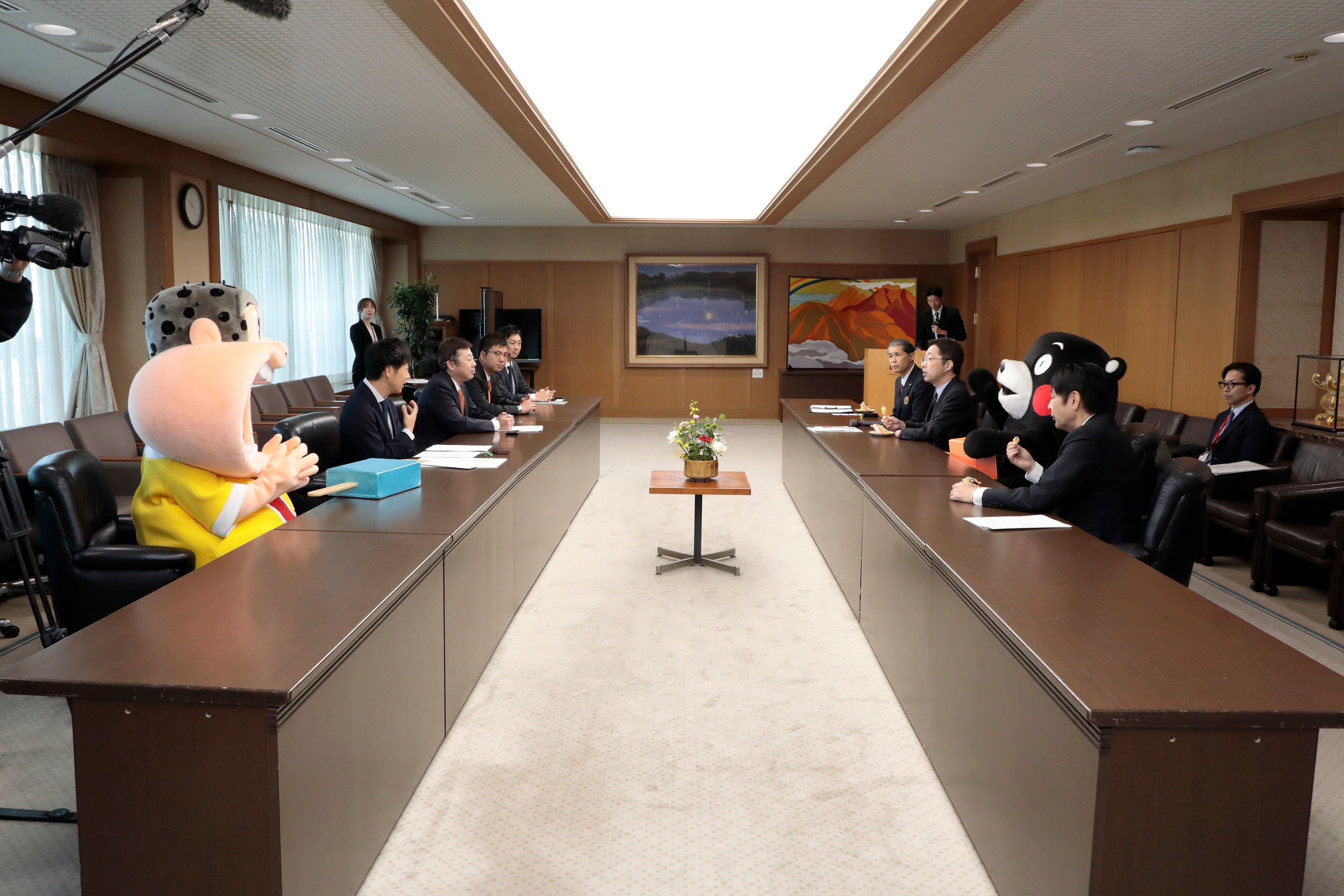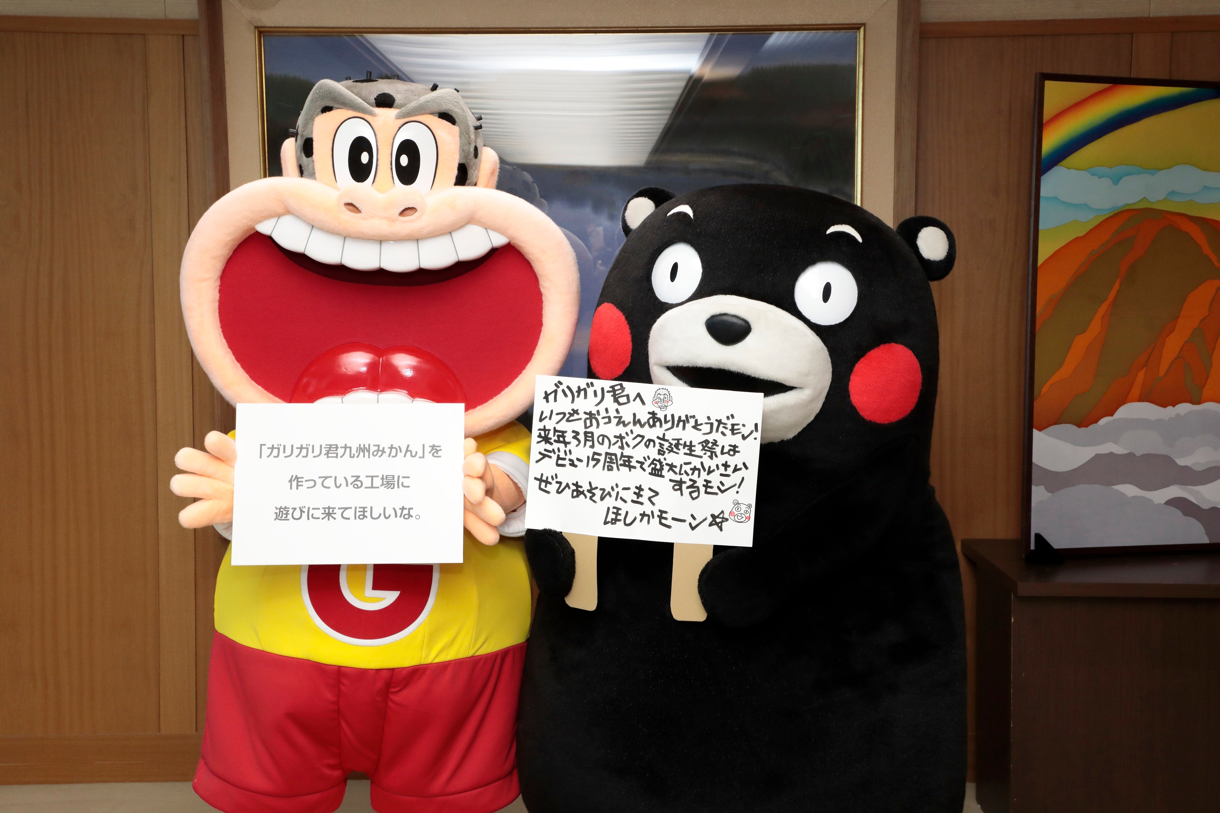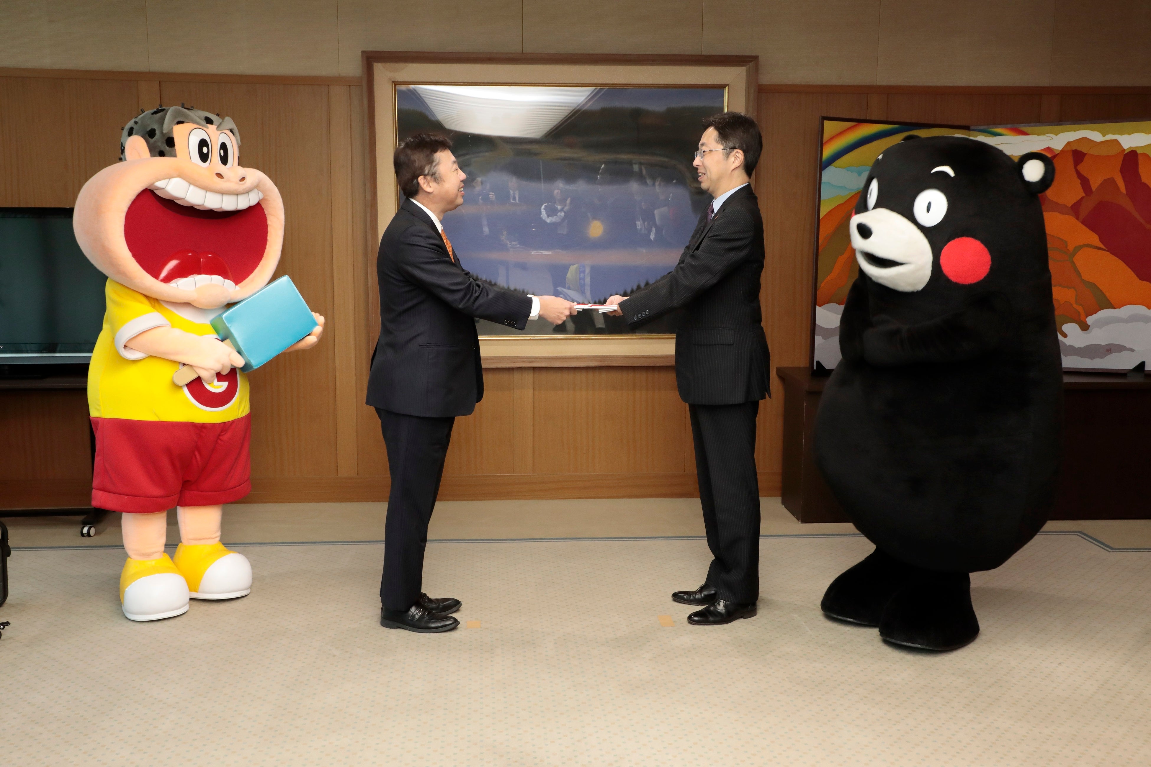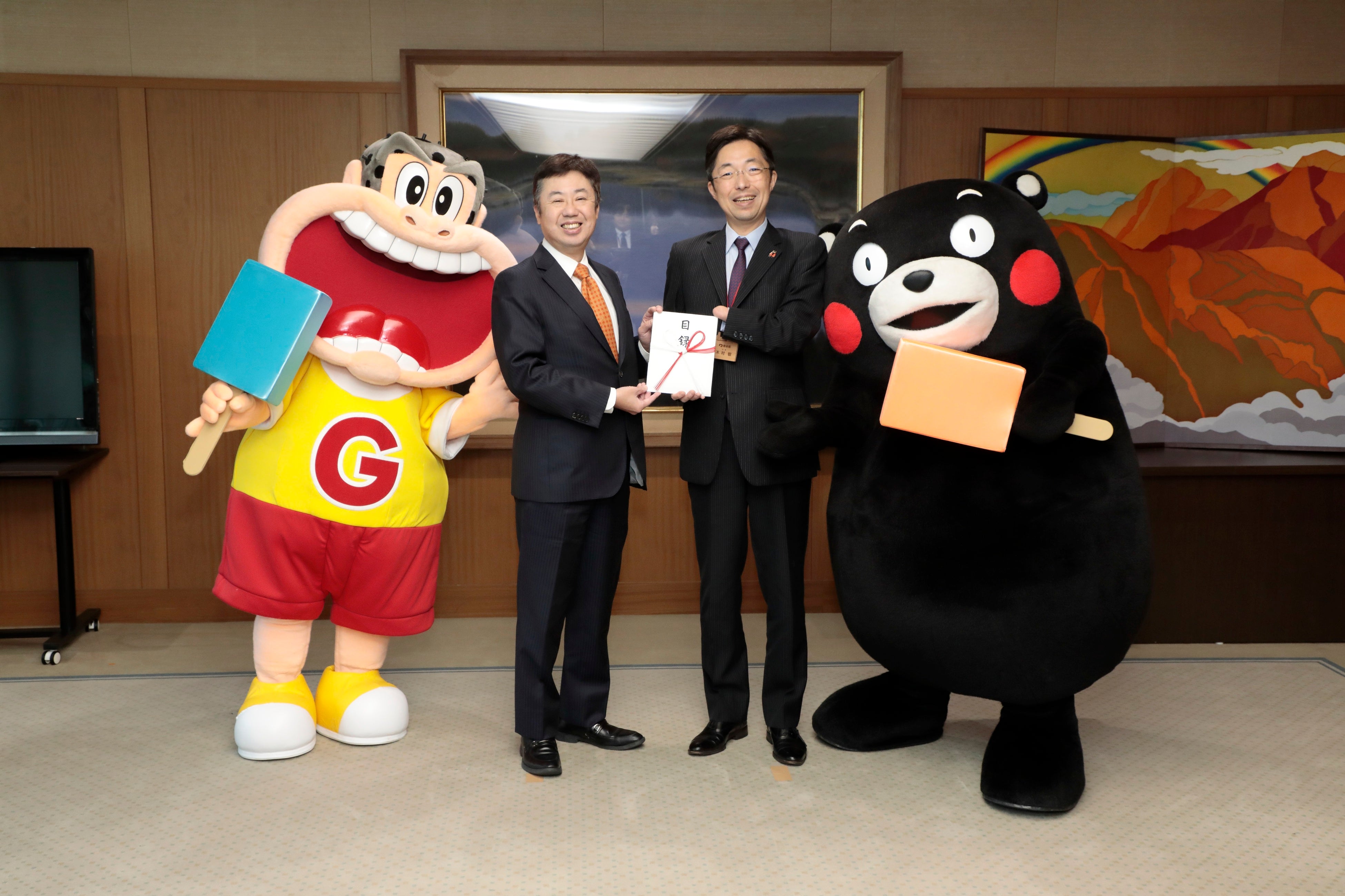 熊本県庁で行われた贈呈式では、熊本県知事木村敬様、くまモン、ガリガリ君出席のもと、赤城乳業から災害復興支援として売り上げの一部を熊本県へ贈呈するとともに、ガリガリ君がくまモンを赤城乳業に遊びにきてもらいたいと工場への招待を行いました。