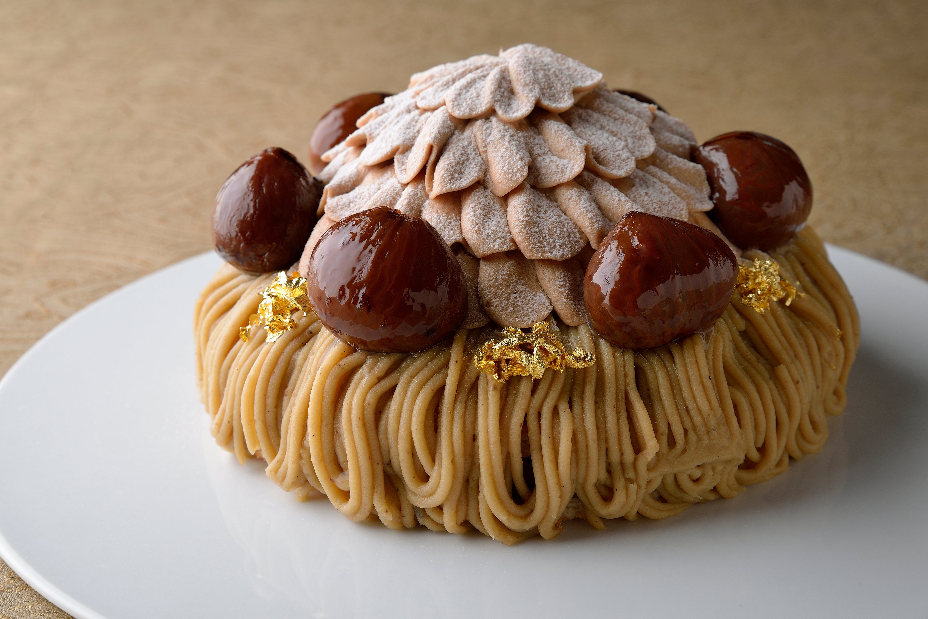 国産の渋皮栗と金箔を飾り、和と洋の2種類の栗のクリームで贅沢で濃厚に仕立てたモンブラン。ベースは、栗パウダーを使用したダックワーズ生地の中に、ミルクとダークのチョコレート2種を使用したカカオの香りが芳醇に広がる滑らかなクレームショコラを挟みました。クレームショコラの中にはヘーゼルナッツのキャラメリゼを入れ、カリカリとした食感をお楽しみいただけます。その上に、マロングラッセとフランボワーズをたっぷりと敷き詰め、和と洋の2種類の栗の濃厚なクリームで、ドレスをモチーフにしたクリスマス仕様にデコレーションして仕上げました。