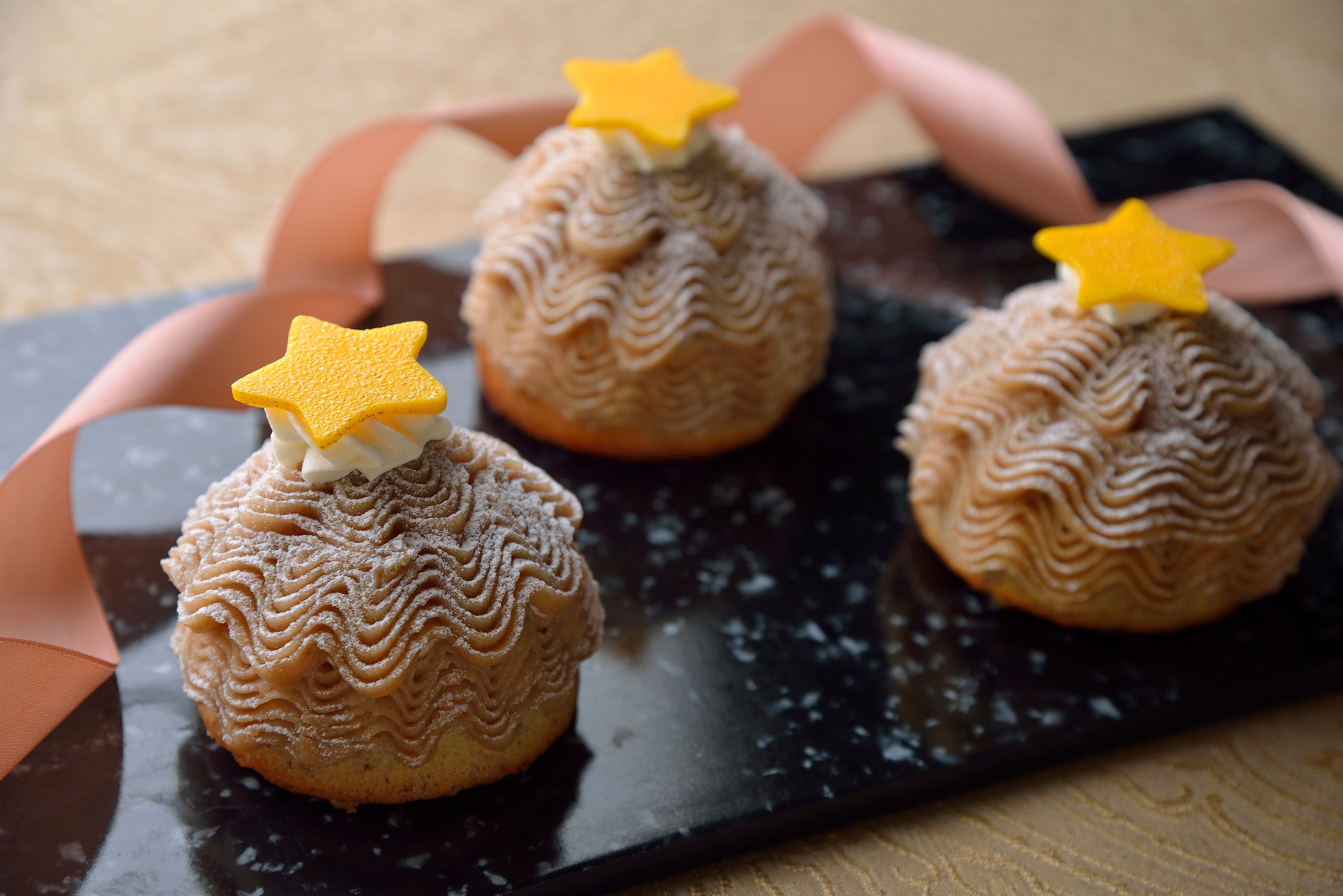 ヘーゼルナッツのフィナンシェの上にマロングラッセをのせ、マロンクリームをクリスマスツリーに見立