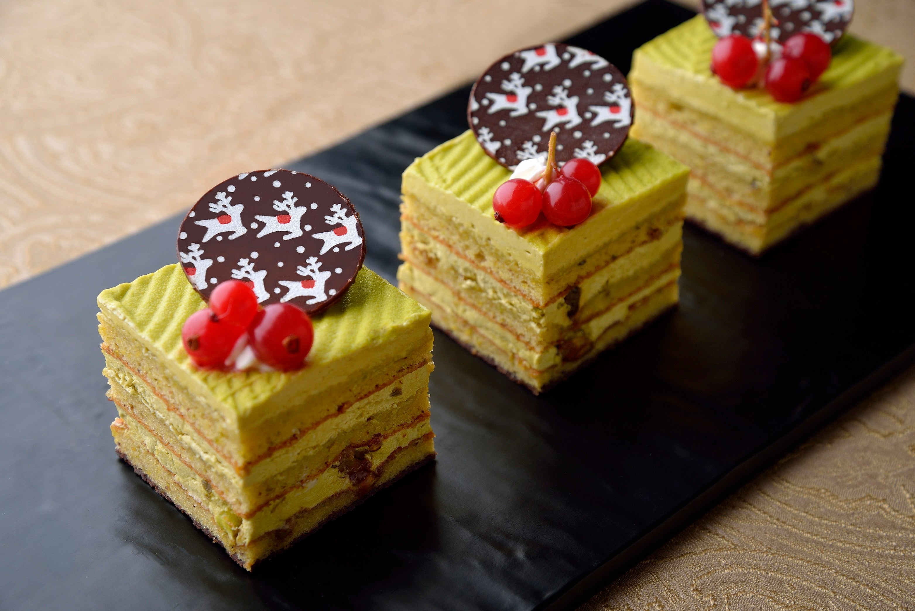 ク深いケーキです。グロゼイユの鮮やかな赤色とピスタチオの緑色を掛け合わ