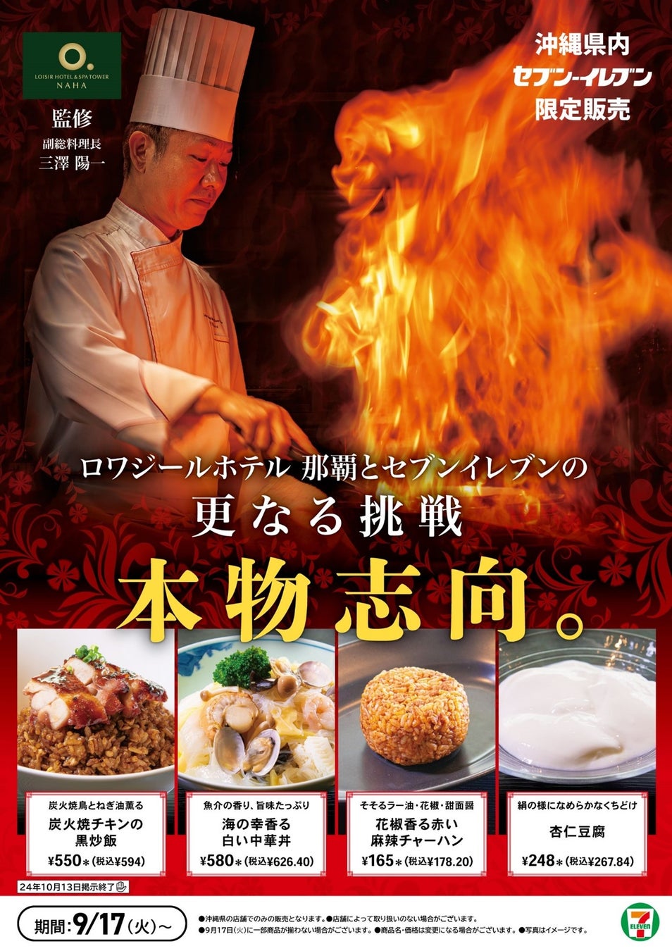 ソラーレ ホテルズ アンド リゾーツ株式会社(所在地:東京都港区、代表取締役社長:井上 理)が運営する、ロワジールホテル & スパタワー 那覇と株式会社セブン‐イレブン・沖縄(所在地:沖縄県那覇市、代表取締役社長:久鍋 研二)が商品の共同開発を実施、ロワジールホテル 那覇 副総料理長である三澤 陽一(みさわ よういち)の監修の下、食材や調理法にこだわり、ホテルならではの中華料理4品「炭火焼チキンの黒炒飯」「海の幸香る白い中華丼」「花椒香る赤い麻辣チャーハン」「杏仁豆腐」