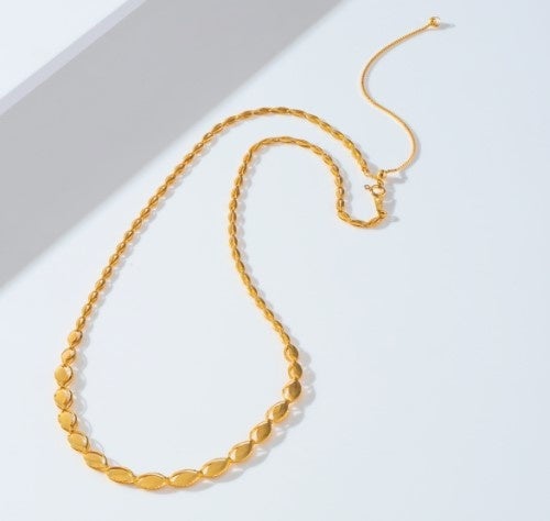 日本のチェーンメーカーだからこその職人技が光る純金のネックレスを紹介します。冬の装いにも映えるサイズグラデーションがポイントで、造幣局の検定マーク付きでお届けします。