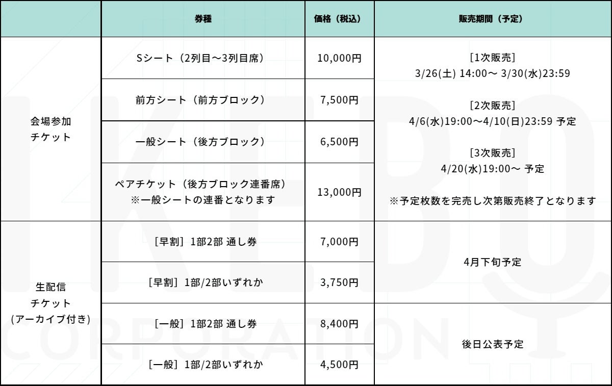 ご参加方法は、「イベント会場参加」と「オンライン参加」の2種類からお好きな回を選んでご購入いただけます。今回から、前から2列目までお席確約の“Sシート”や、ご友人やご家族と一緒にお隣同士の席でお楽しみいただける“ペアチケット”も登場!