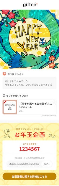 2024年の幕開けを祝したお年玉キャンペーンを「giftee®」で開催します。2023年12月27日(水)〜2024年1月10日(水)の期間中に発行されたeギフトを受け取られた方が対象となるキャンペーンです。ギフトカード画面下部に表示される「お年玉抽選番号」から参加可能です。当選発表は2024年1月15日(月)10:00から実施され、当選者には「giftee Box for 新年」を合計50名様にプレゼントいたします。なお、期間中は「ギフトを贈る」ボタンから発行された全てのeギフトに「お年玉抽選番号」が付与されます。(特集ページURL:https://giftee.com/announcements/355 )