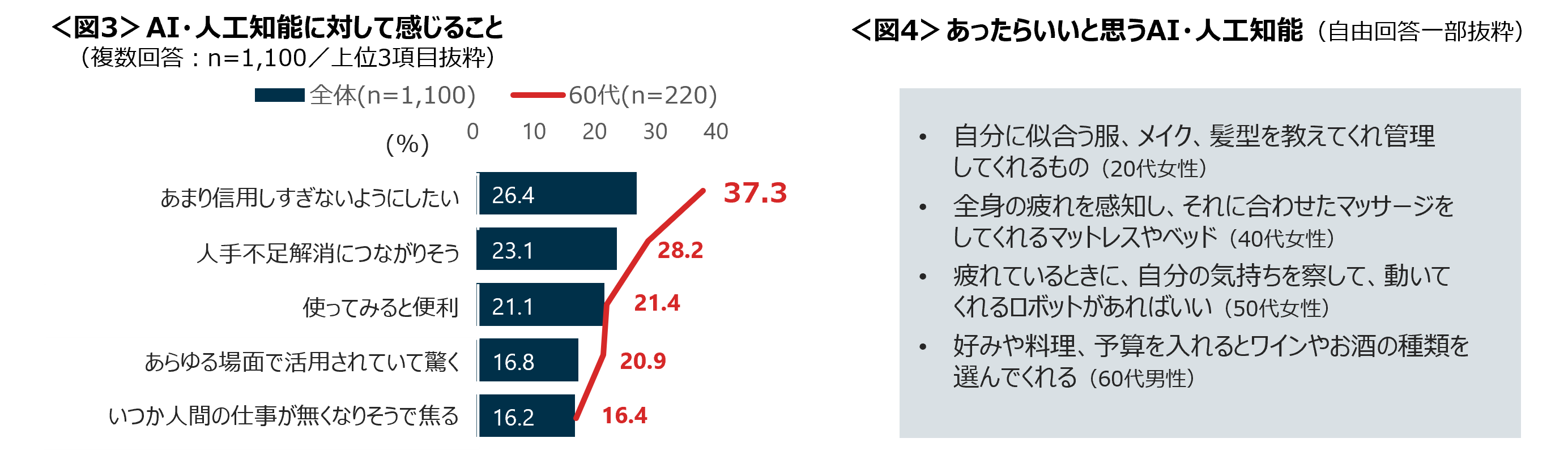 AIに対して感じることでは、「信頼しすぎないようにしたい」が26.4%と最も高い。特に60代では37.3%にのぼる。一方、「人手不足解消につながりそう」という期待や「使ってみると便利」という回答も2割を超え、トップ3にあがる。<図3>