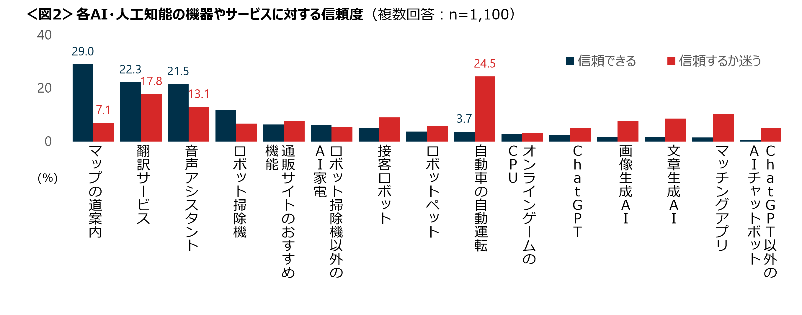 各サービスに対して信頼できると感じている人の割合をみると、「マップの道案内」は3割近くであり、「翻訳サービス」と「音声 アシスタント」は2割程度となっている。ただし、「翻訳サービス」は信頼できるか迷うと回答した人の割合も2割弱であり、信頼性・精度にはいまだ疑問を感じている人も一定数みられる結果となった。「自動車の自動運転」は、信頼できるか迷うと回答した人の割合が、信頼できると回答した人より20.8pt高く、精度に対して懐疑的な人が多い。現状まだ経験した利用者は少ないが、注目されているサービスであると考えられる。<図2>
