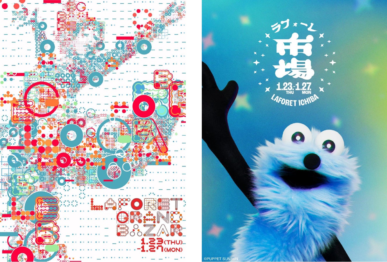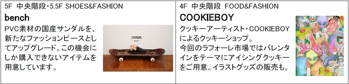 「ラフォーレ市場」では、館全体が“ファッション・カルチャーの市場”となり、アイシングクッキーの人気アーティスト「COOKIEBOY」、国内流通の少ないアイテムを中心に植物から香水・アパレルまで幅広く取り扱う「月泥棒」、職人技を活かしたPVCシューズのブランド「bench」など、セール以外のお買い物にも充実したラインナップを揃えます。「ラフォーレ市場」のビジュアルや装飾には今注目のキャラクター「パペットスンスン」(CHOCOLATE Inc. 所属)が登場し、館内を楽しく盛り上げます。