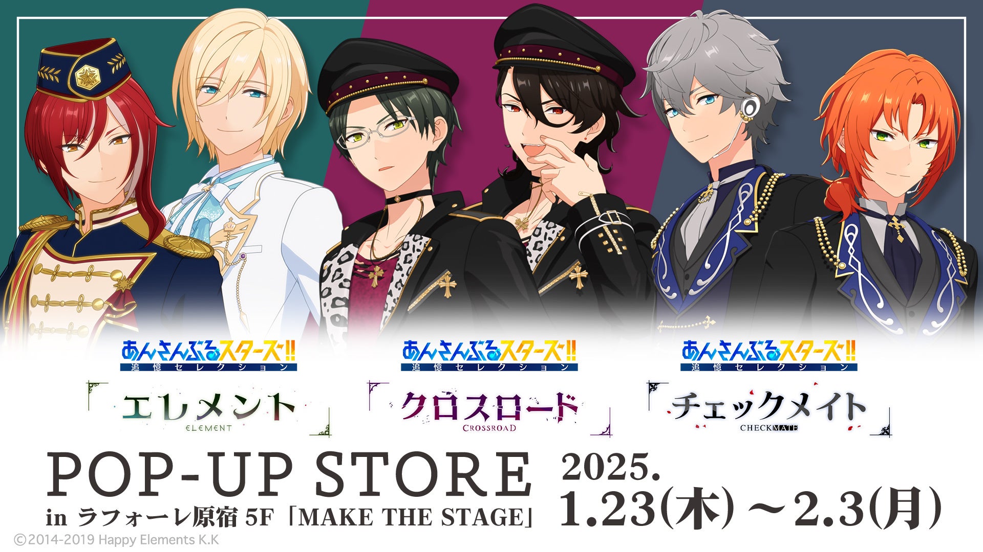 あんさんぶるスターズ!!追憶セレクション『エレメント』『クロスロード』『チェックメイト』のポップアップストアが2025年1月23日(木)より開催!アニメの場面写を使用したグッズや、立ち絵グッズなどオリジナルグッズや、新商品も数多く販売します。グッズ購入金額1会計1,000円(税込)ごとにランダムでラフォーレ原宿限定の「場面写ポストカード」を1枚プレゼント。