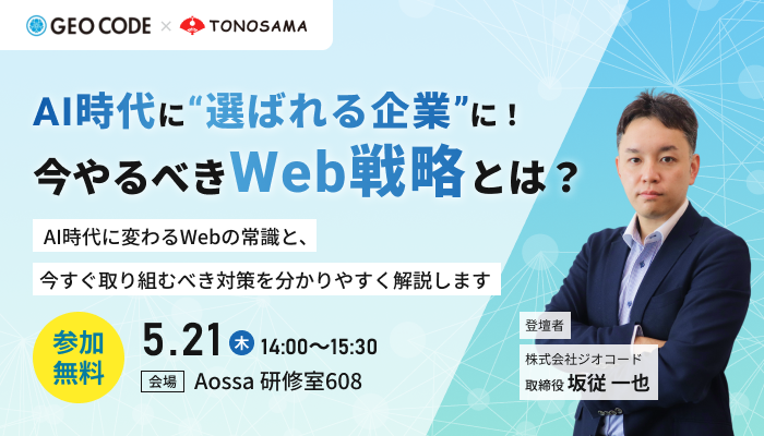 Webマーケティングとクラウドセールステック事業を展開する株式会社ジオコード(本社:東京都新宿区、代表取締役:原口 大輔、証券コード:7357)は、2026年5月21日(木)に福井市内で開催されるAIセミナー「AI時代に“選ばれる企業”に!今やるべきWeb戦略とは?」(主催:株式会社TONOSAMA)において取締役の坂従一也が登壇・講演することをお知らせします。